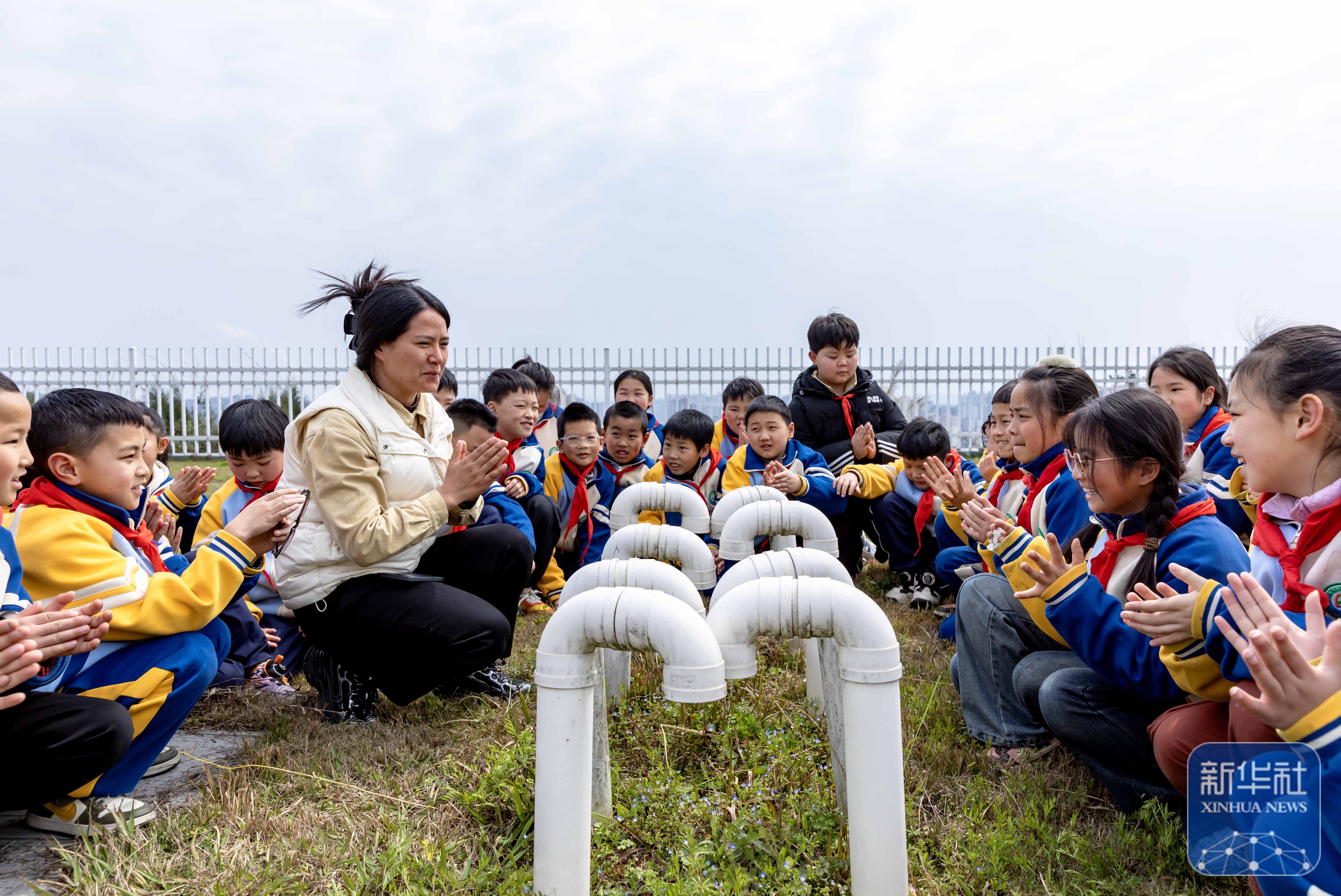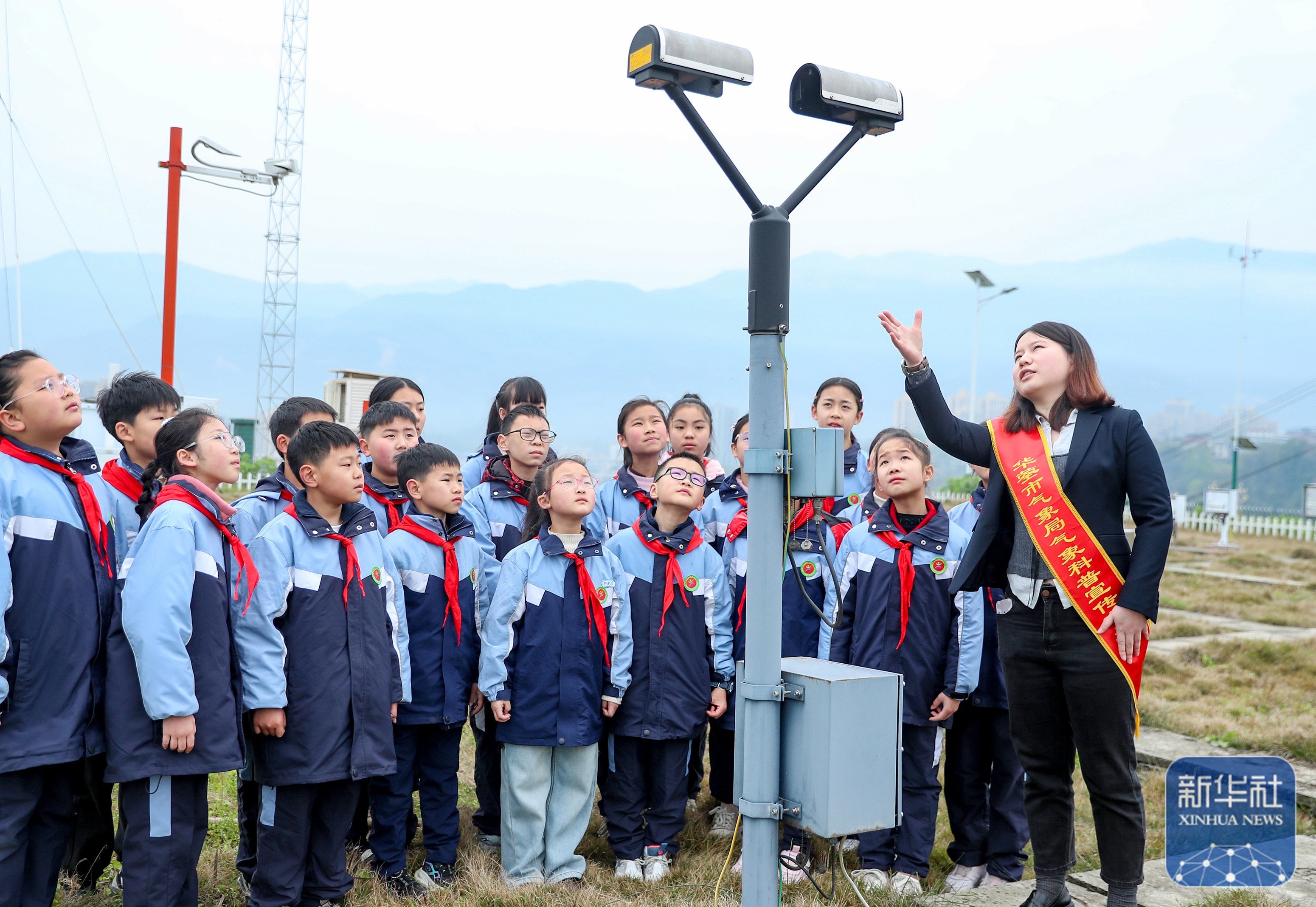 ↑3月21日,学生在贵州省黔西国家基本气象站听业务员科普深层地温场设备工作原理。新华社发(范晖摄)