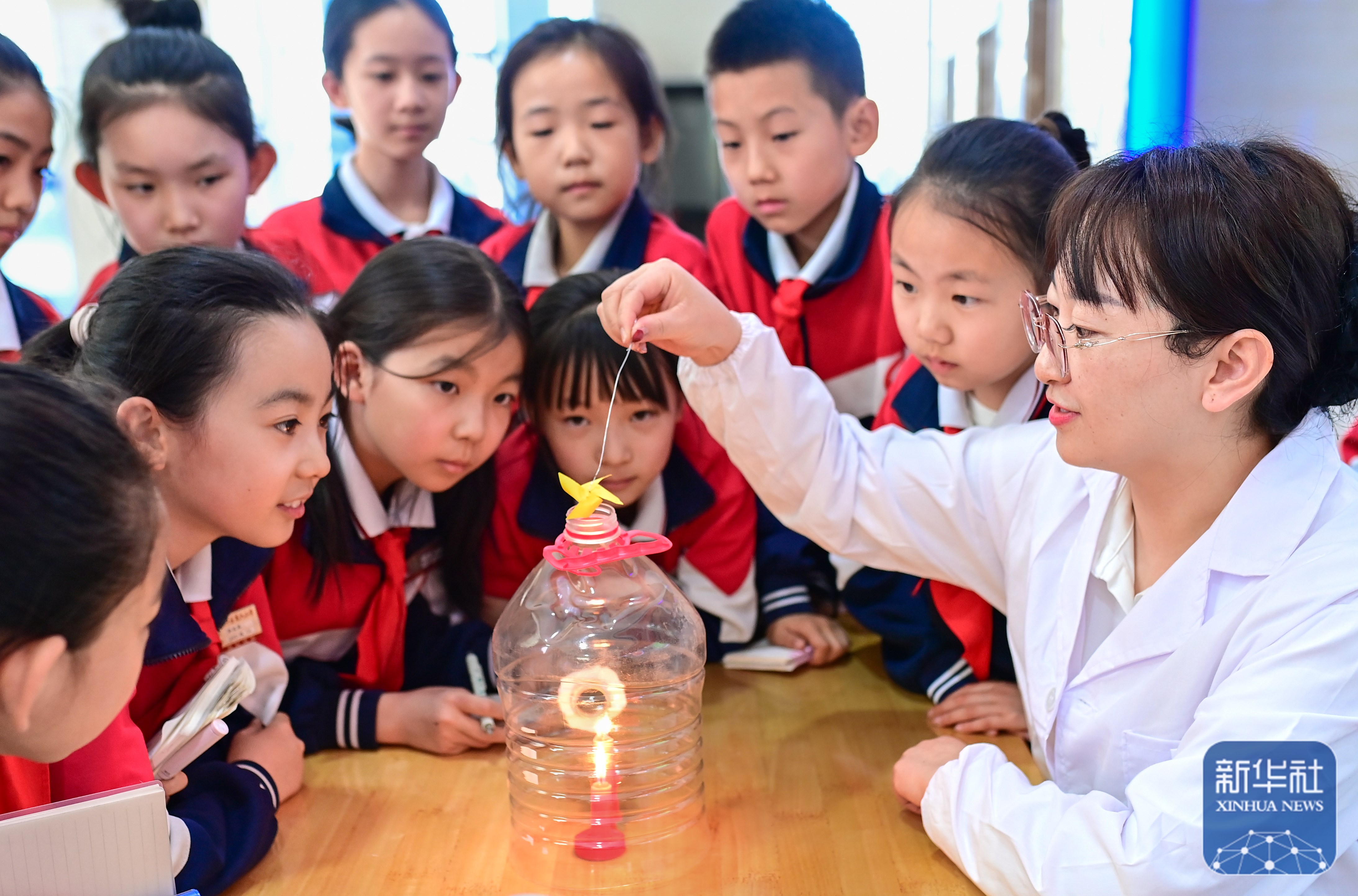 ↑3月21日,在内蒙古鄂尔多斯气象防灾减灾科普馆,学生观看“风的形成”科学实验。新华社发(王正摄)