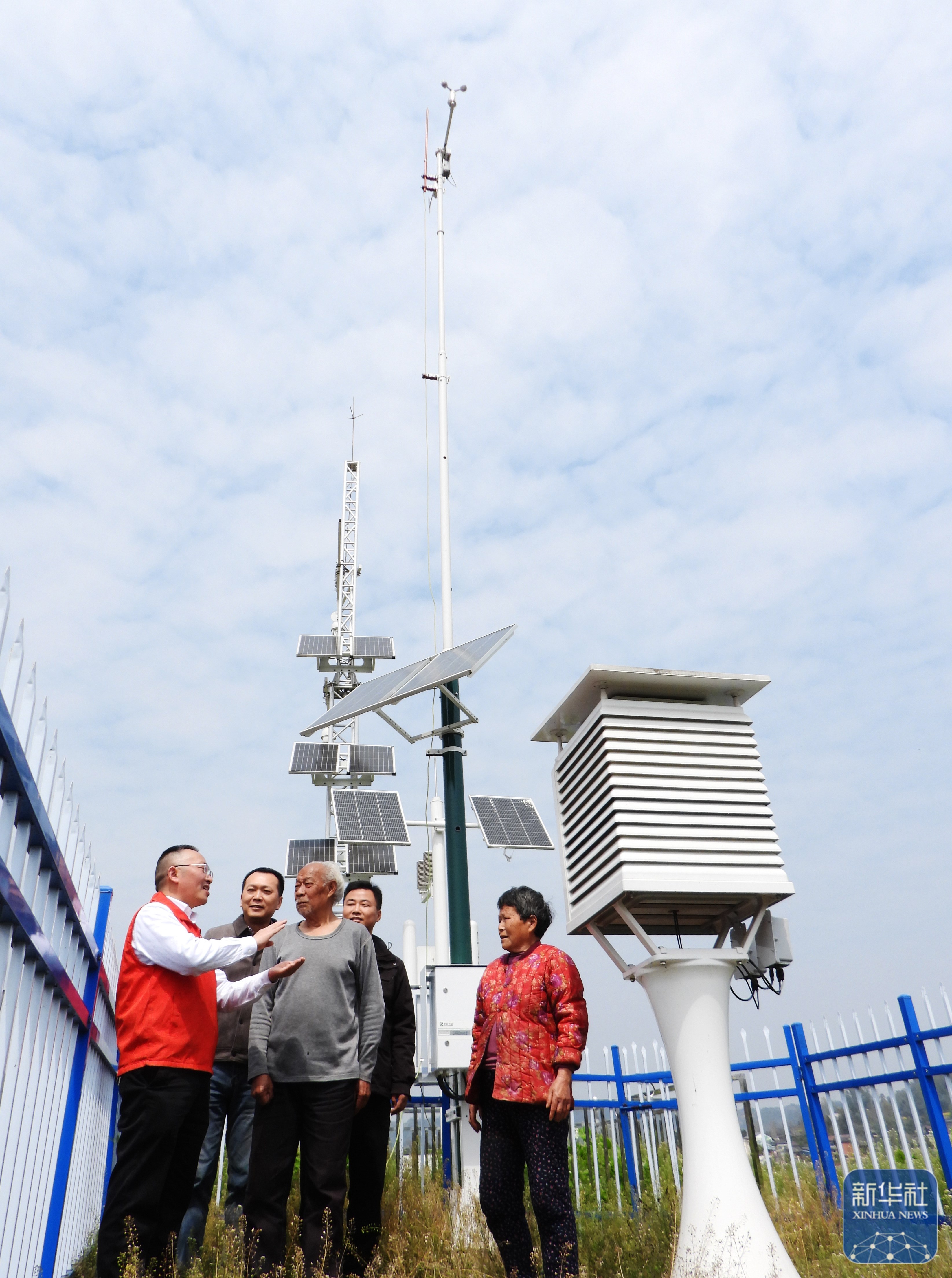 ↑3月21日,在四川省达州市农科院北斗试验基地气象观测站,达州市气象局技术员为种植户讲解农业气象灾害防御知识。新华社发(邓良奎摄)