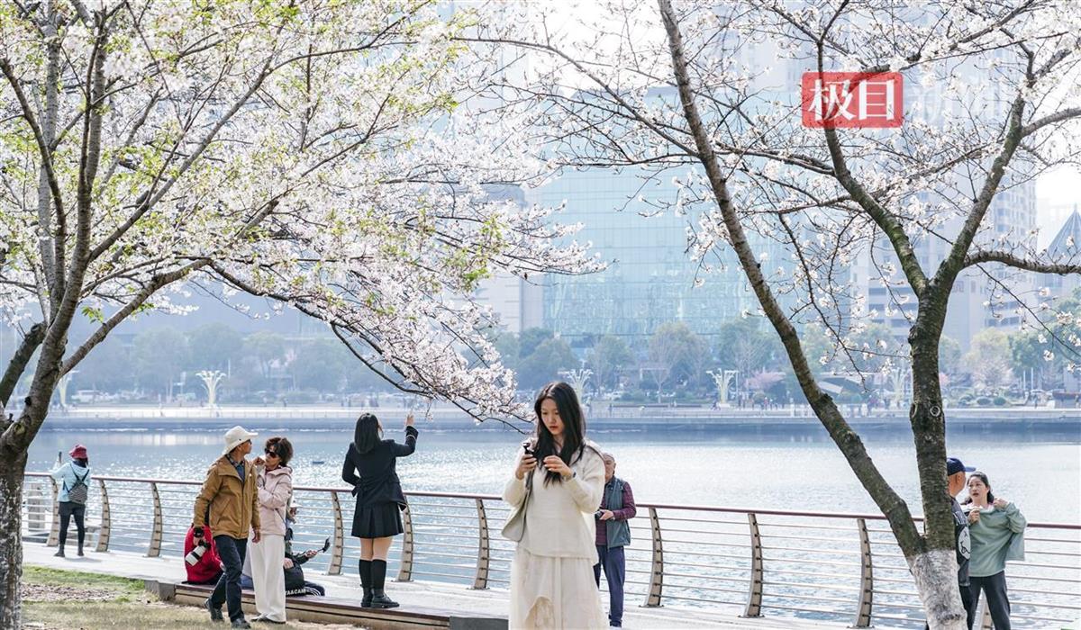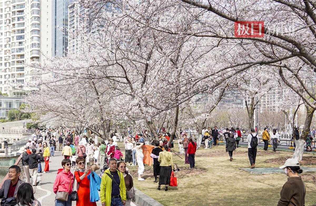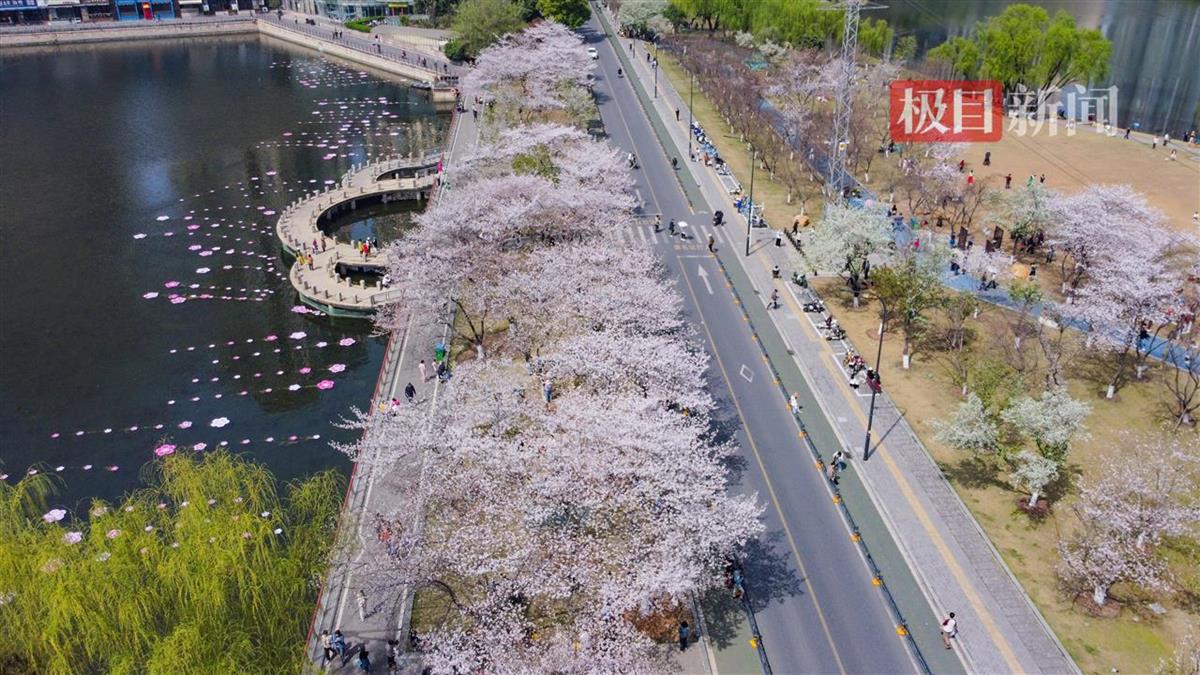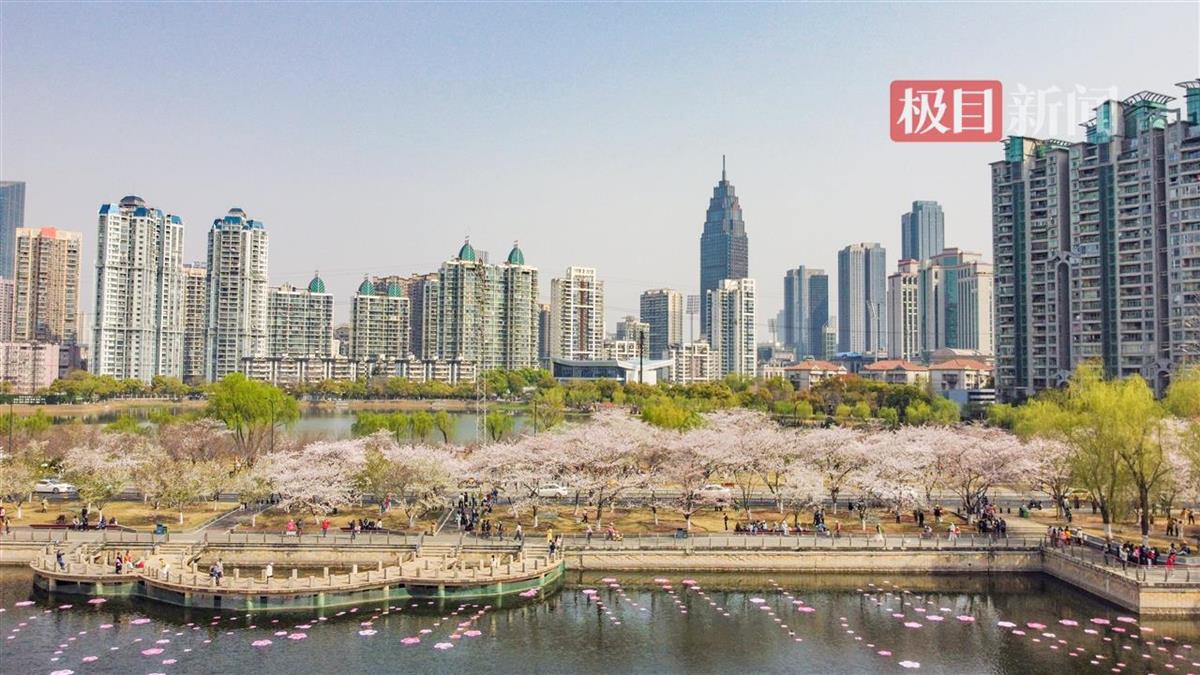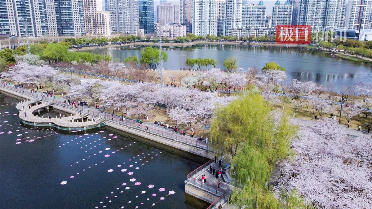 3月24日,汉口西北湖公园樱花大道樱花盛放,如云霞般绚烂夺目。粉白的花带、清澈的湖泊和周边摩天大楼相映成趣,舒展着春日美景。