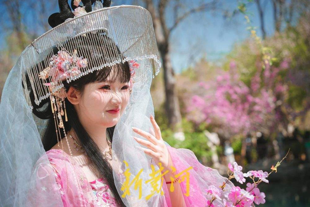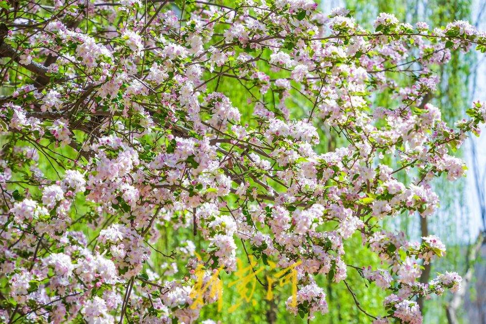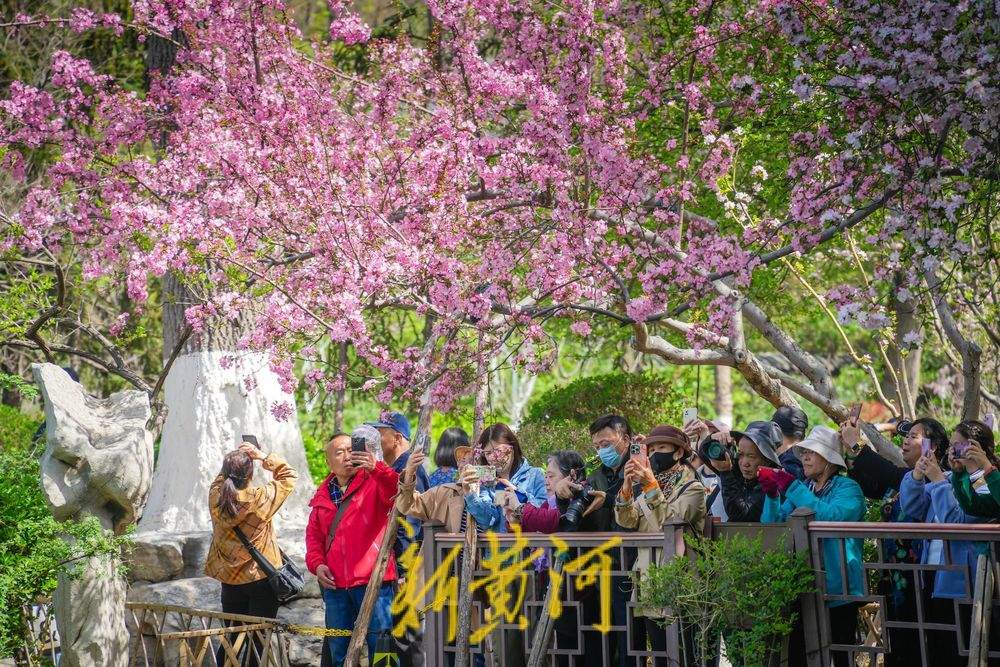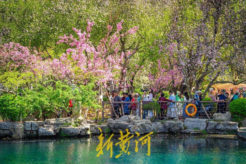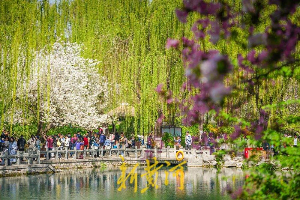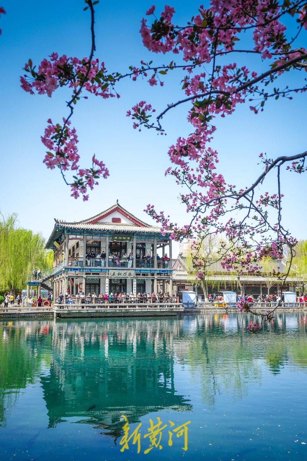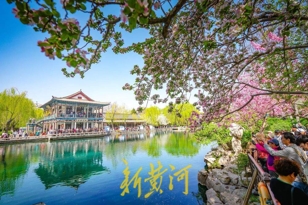 3月24日,济南晴空万里,暖阳高照,当日最高气温为23℃,五龙潭公园内垂丝海棠与西府海棠竞相盛开,粉白相间的花海与古色古香的名士阁相映成趣,如此美景吸引众多市民驻足拍照观赏。