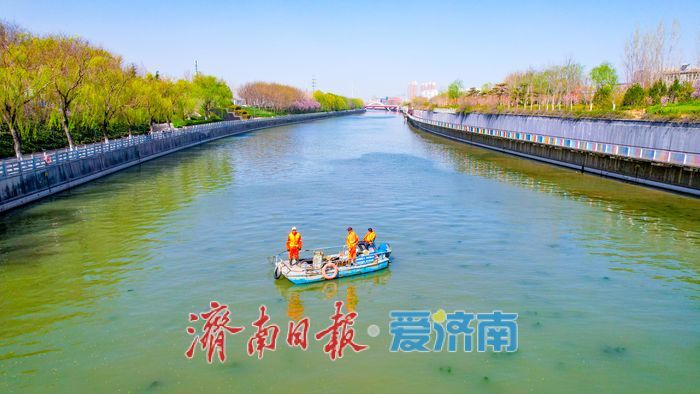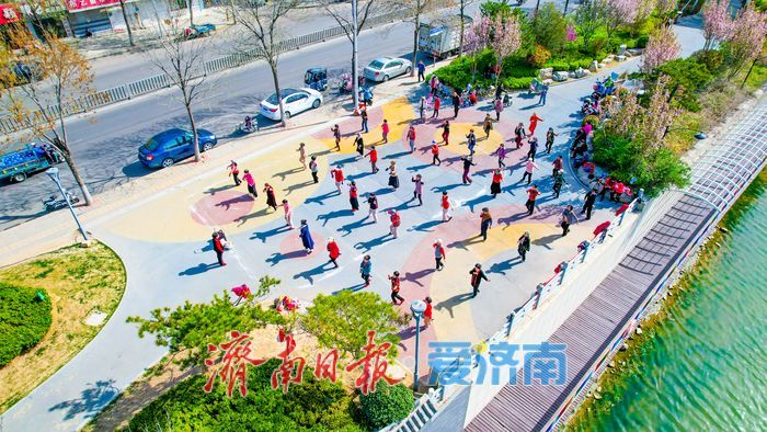 在小清河沿岸,不少市民漫步其中,感受春天的气息。河面上,工作人员正乘船打捞水中的杂物,维护河道的清洁,为市民营造更加优美的环境。附近的广场上,一群热爱健身的市民随着音乐跳起健身操,展现出春日里的活力与热情。