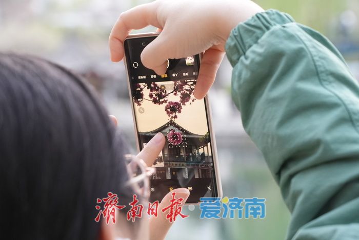 3月25日,济南五龙潭畔春色正浓,盛放的海棠吸引众多市民游客前来观赏。前来游玩的市民游客沉醉于美景,纷纷掏出手机,站在最佳“C位”记录绝美的烂漫瞬间,再分享给亲朋好友,一同感受泉城春日的蓬勃生机。