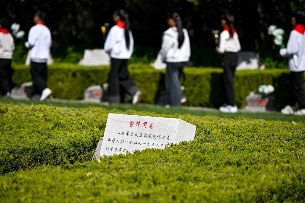4月1日,石家庄市宁安路小学学生在华北军区烈士陵园瞻仰革命烈士墓碑。新华社记者 刘金海 摄