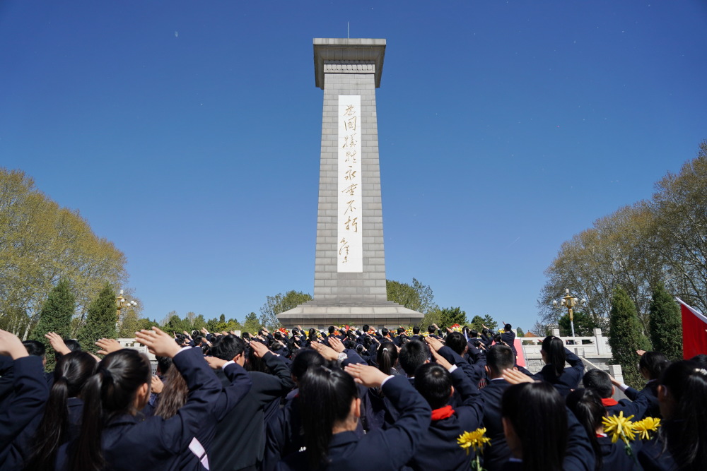 4月1日,在位于石家庄市的华北军区烈士陵园,学生在烈士纪念碑前敬礼。新华社记者 牟宇 摄