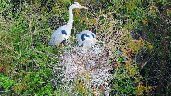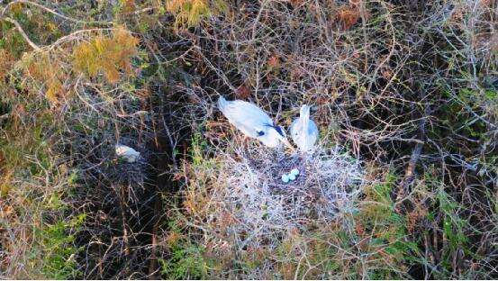 每年春季,这些优雅的“湿地精灵”如约而至,在这里筑巢、繁衍。苍鹭对栖息地的选择极为讲究,它们偏爱湿地中的水杉、乔木等高大植物,利用折断的枝条精心搭建巢穴。每年二三月,苍鹭进入繁殖期,雌鸟产下首枚卵后,雌雄亲鸟便开始轮流孵化。正午气温升高时,它们会短暂离巢,舒展翅膀、晾晒羽毛,确保孵化环境的舒适。