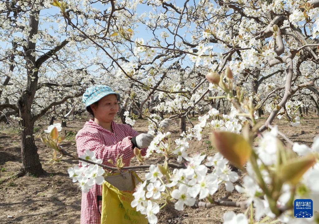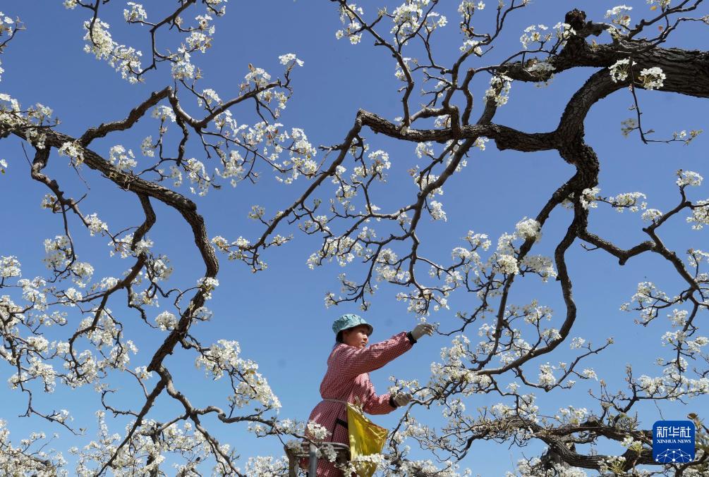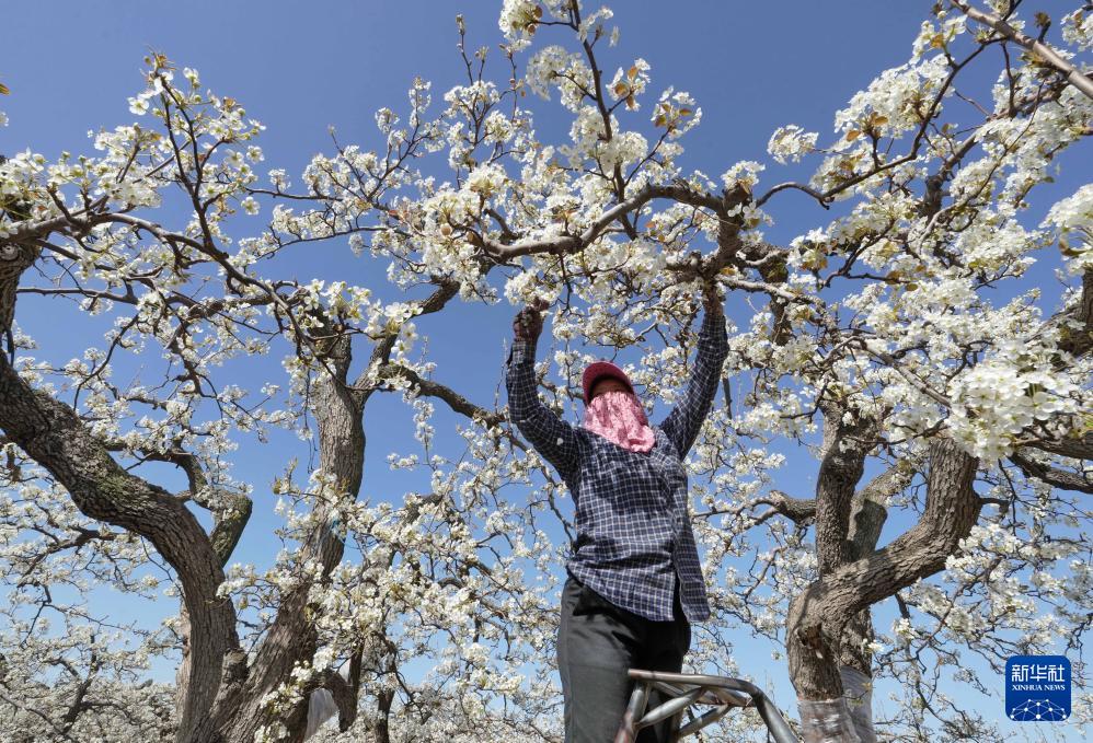近日,河北省赵县的25万亩梨树陆续开花,当地果农抢抓农时,给梨树疏花授粉。
