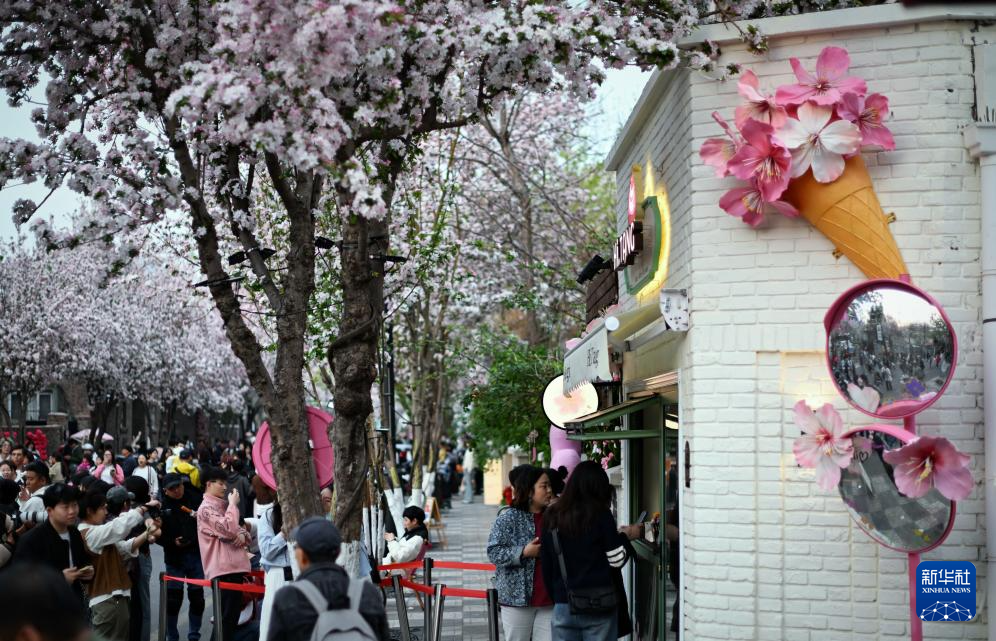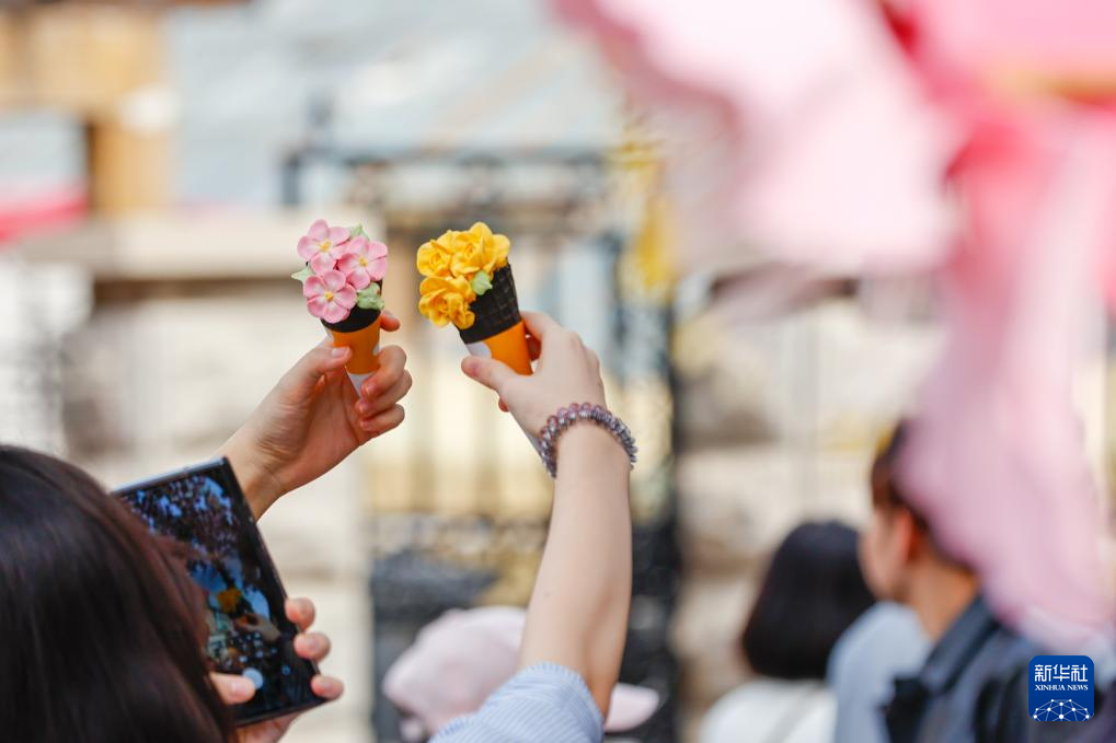 4月4日,在天津市五大道风景区,游客手举海棠花造型雪糕拍照留影。新华社发(杜鹏辉 摄)