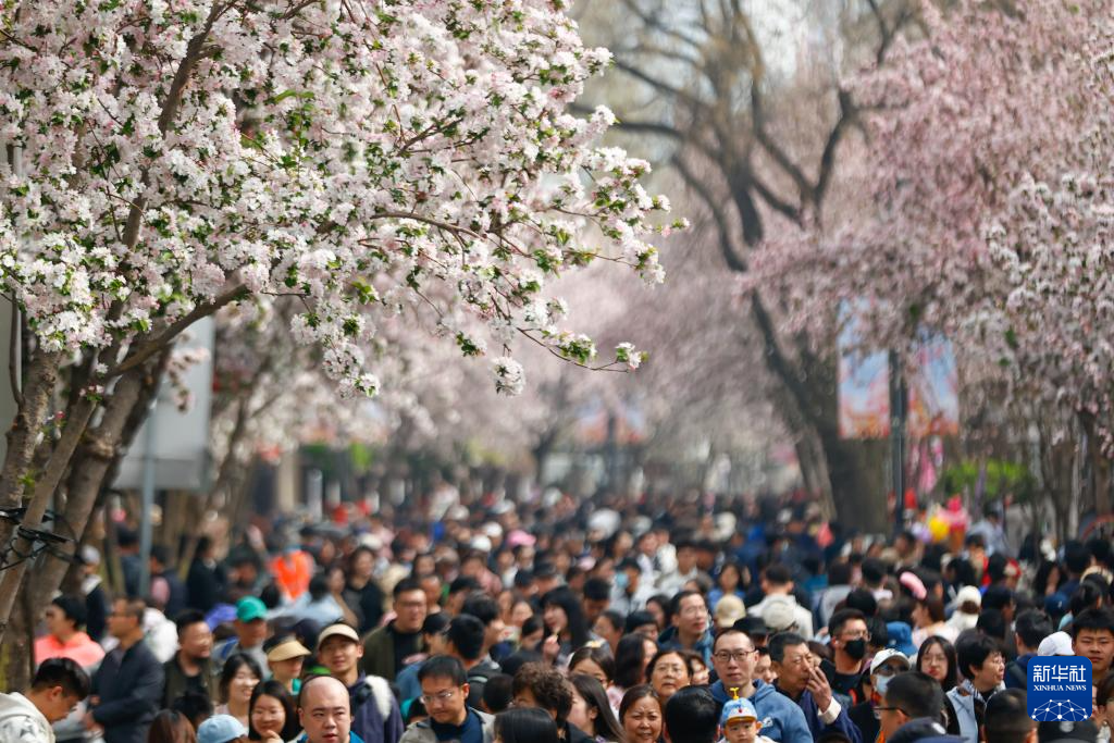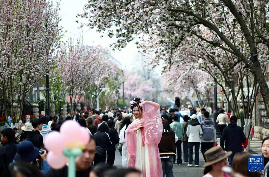 4月4日,人们在天津市五大道风景区游览赏花。新华社发(杜鹏辉 摄)