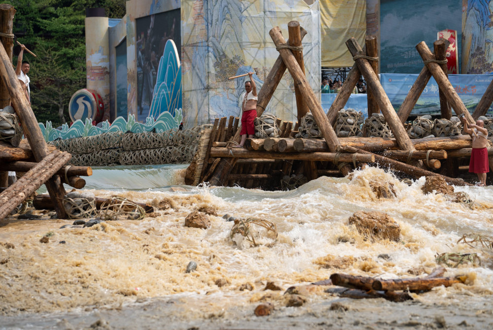 4月4日,在2025都江堰放水节上,堰工砍断杩槎的绳索后,岷江水奔流而下。