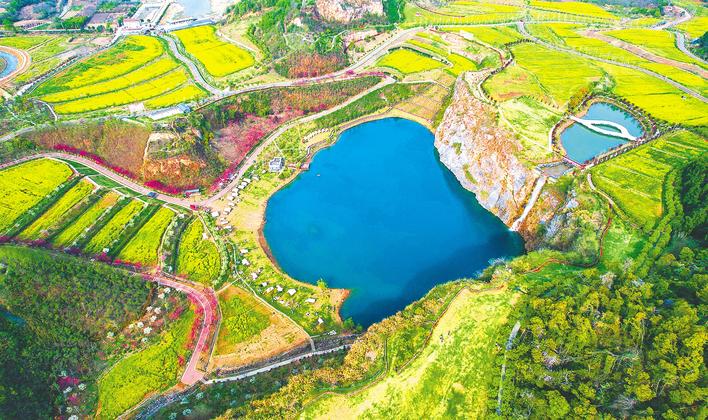 4月2日,鸟瞰武汉江夏区首个矿山主题景区——江夏灵山生态文化旅游区。这里不仅有生态之美,更有“矿花”之妙。矿山奇景、飞瀑、湖泊与油菜花海形成独特对比,硬朗与柔美并存,别具一格,是露营与摄影爱好者的天堂,更是探索自然奥秘的绝佳之地。(湖北日报全媒记者 朱熙勇 摄)