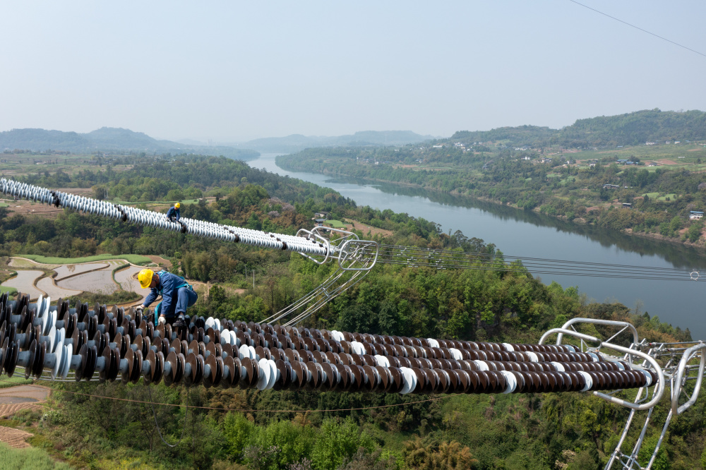 4月8日,在重庆市合川区,国网重庆超高压公司工作人员对“疆电入渝”特高压工程重庆段进行走线验收。新华社记者 刘潺 摄