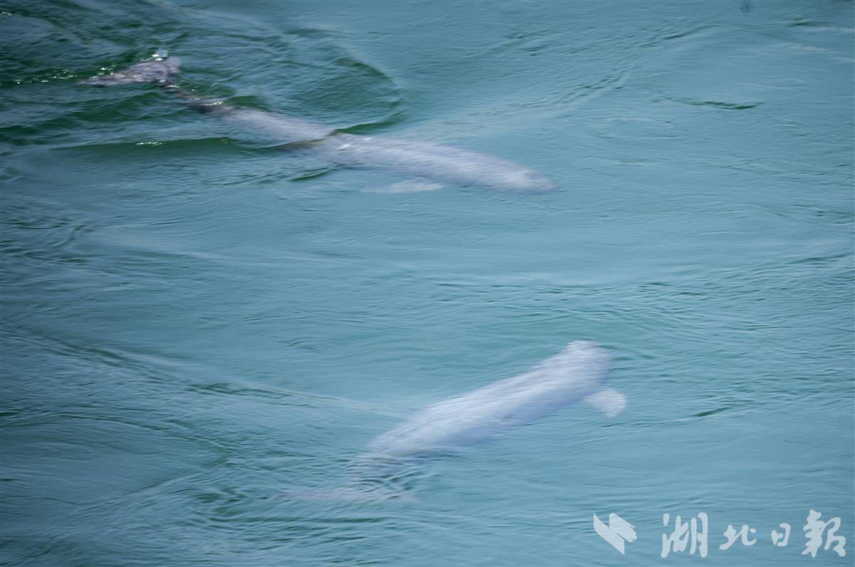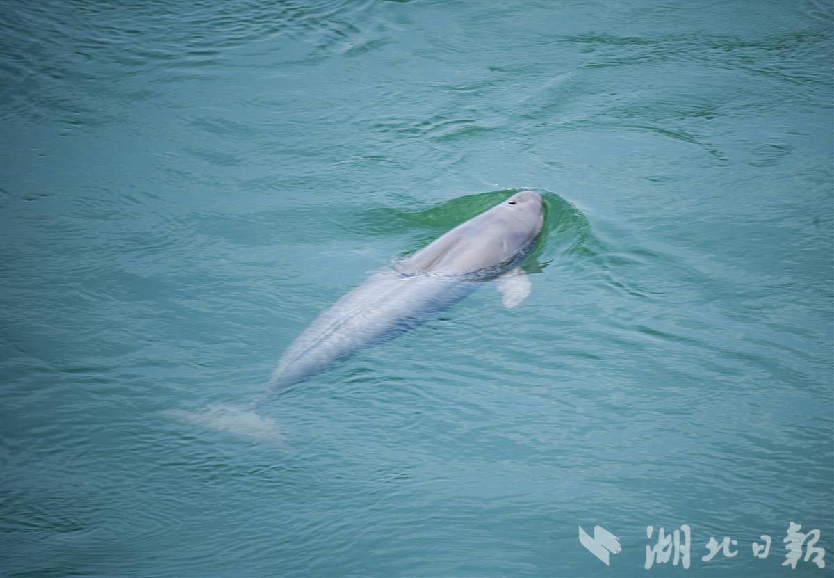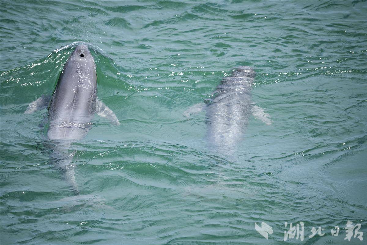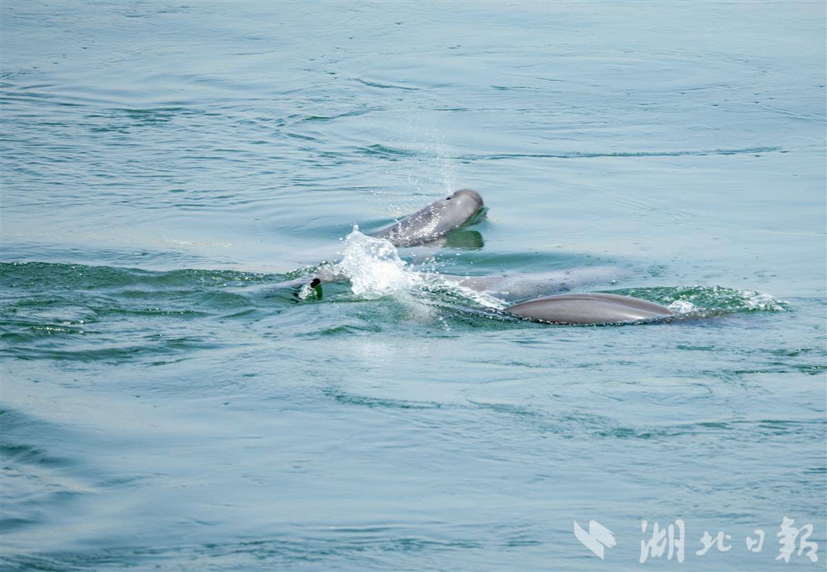 4月8日,江豚在宜昌市葛洲坝电厂二江水域玩耍。时下,“微笑天使”长江江豚进入活跃季,4月8日,葛洲坝电厂二江水域,一群可爱的江豚在碧绿的江水中嬉戏、游玩、舞蹈,可爱至极。(视界网吴承忠摄)