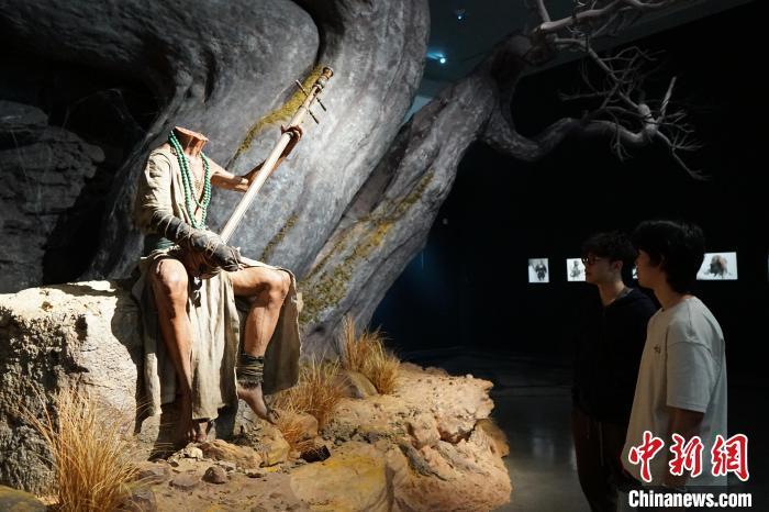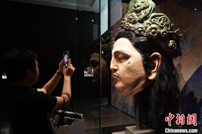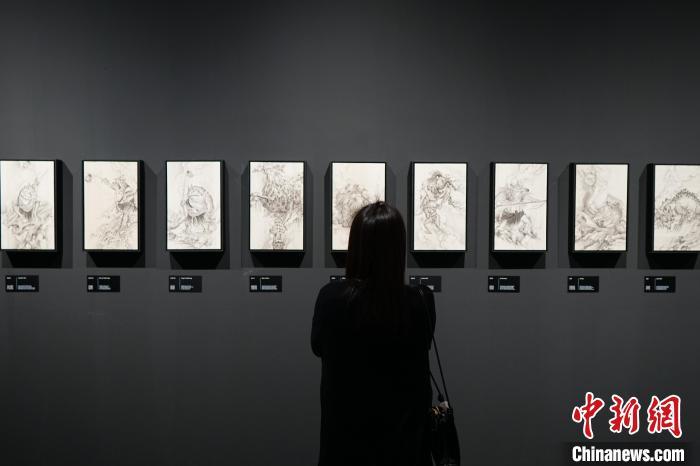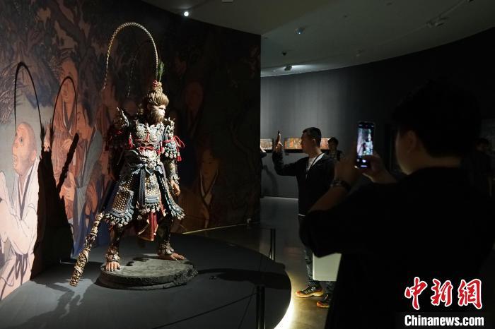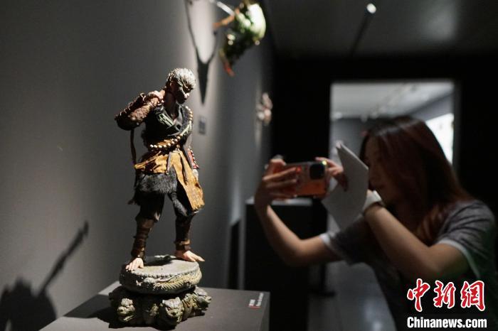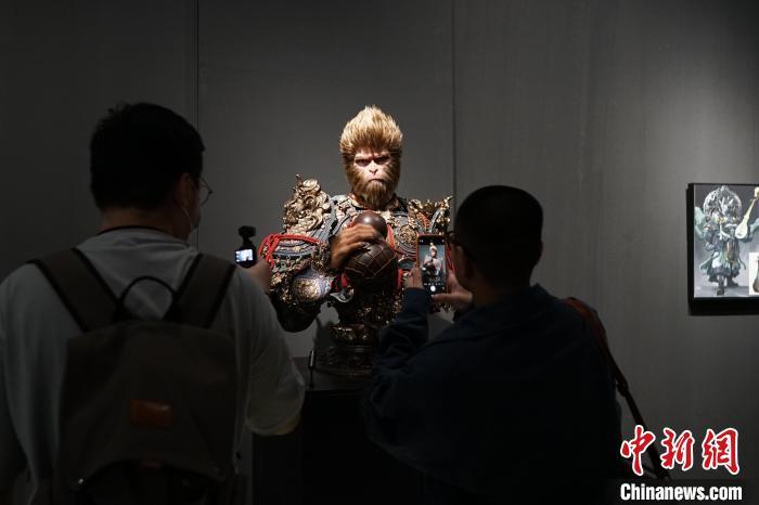 4月9日,游人在“天命人”全身像前拍照。当日,“黑神铸炼”——「黑神话:悟空」主题艺术展在中国美术学院美术馆开幕,展出400多幅原画作品、200多件实物等。展览将持续至5月21日。中新社记者 曹丹 摄