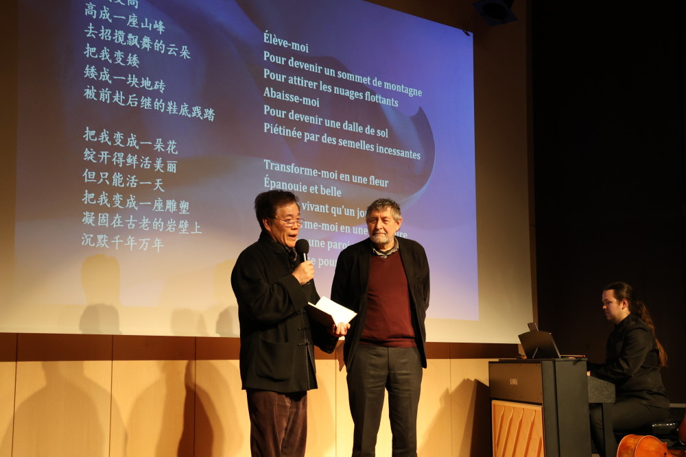 4月8日,在法国巴黎中国文化中心举办的“诗歌的邂逅——‘话中国’中法诗会”现场,中国诗人赵丽宏(左)与法国诗人让-皮埃尔·西梅翁(右)分别用中文和法语朗读中国诗歌。新华社记者 张百慧 摄