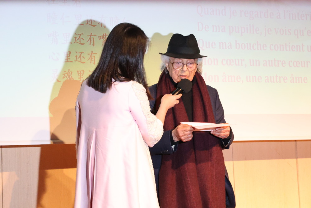 4月8日,在法国巴黎中国文化中心举办的“诗歌的邂逅——‘话中国’中法诗会”现场,叙利亚诗人阿多尼斯(右)用阿拉伯语朗读诗歌。新华社记者 张百慧 摄