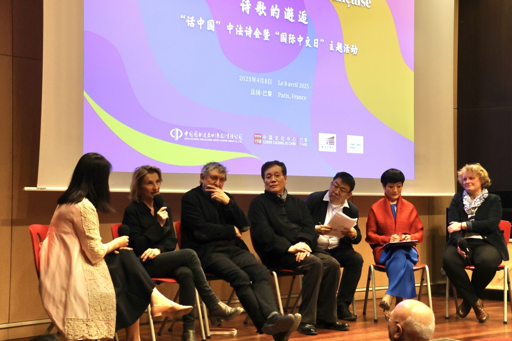 4月8日,在法国巴黎中国文化中心举办的“诗歌的邂逅——‘话中国’中法诗会”现场,嘉宾围绕诗歌创作等主题举行圆桌对话。新华社记者 张百慧 摄