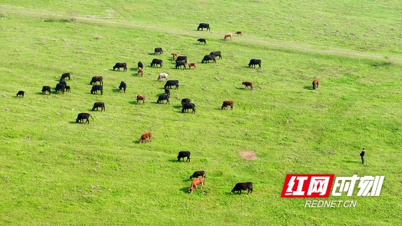 牛群悠闲啃食嫩草,在镜头前表演“吃播”。