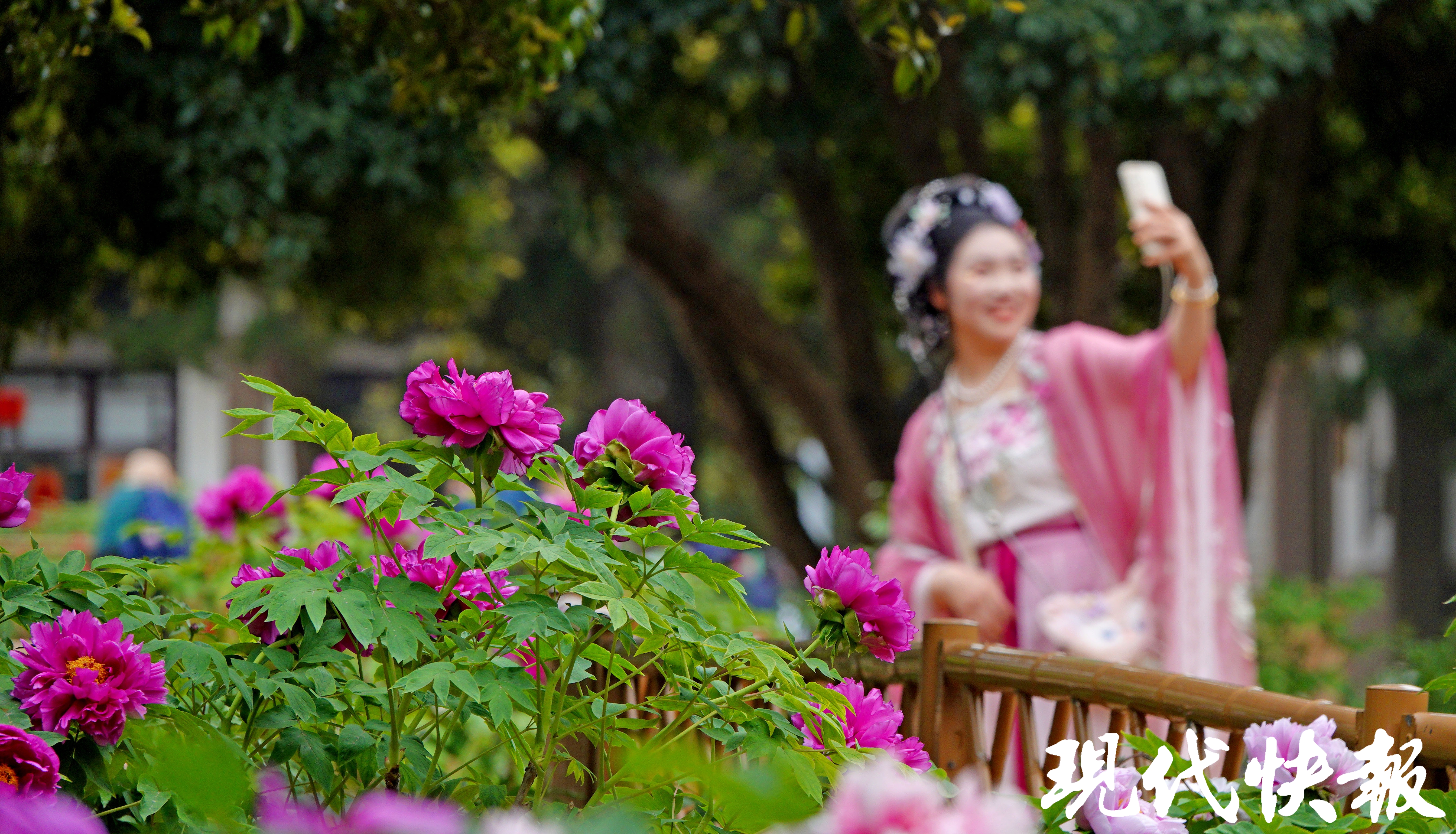 还有人特意穿上汉服前来打卡拍照,人与花相映成趣,在周围的仿古建筑中,沉浸式感受穿越时光的牡丹盛宴。