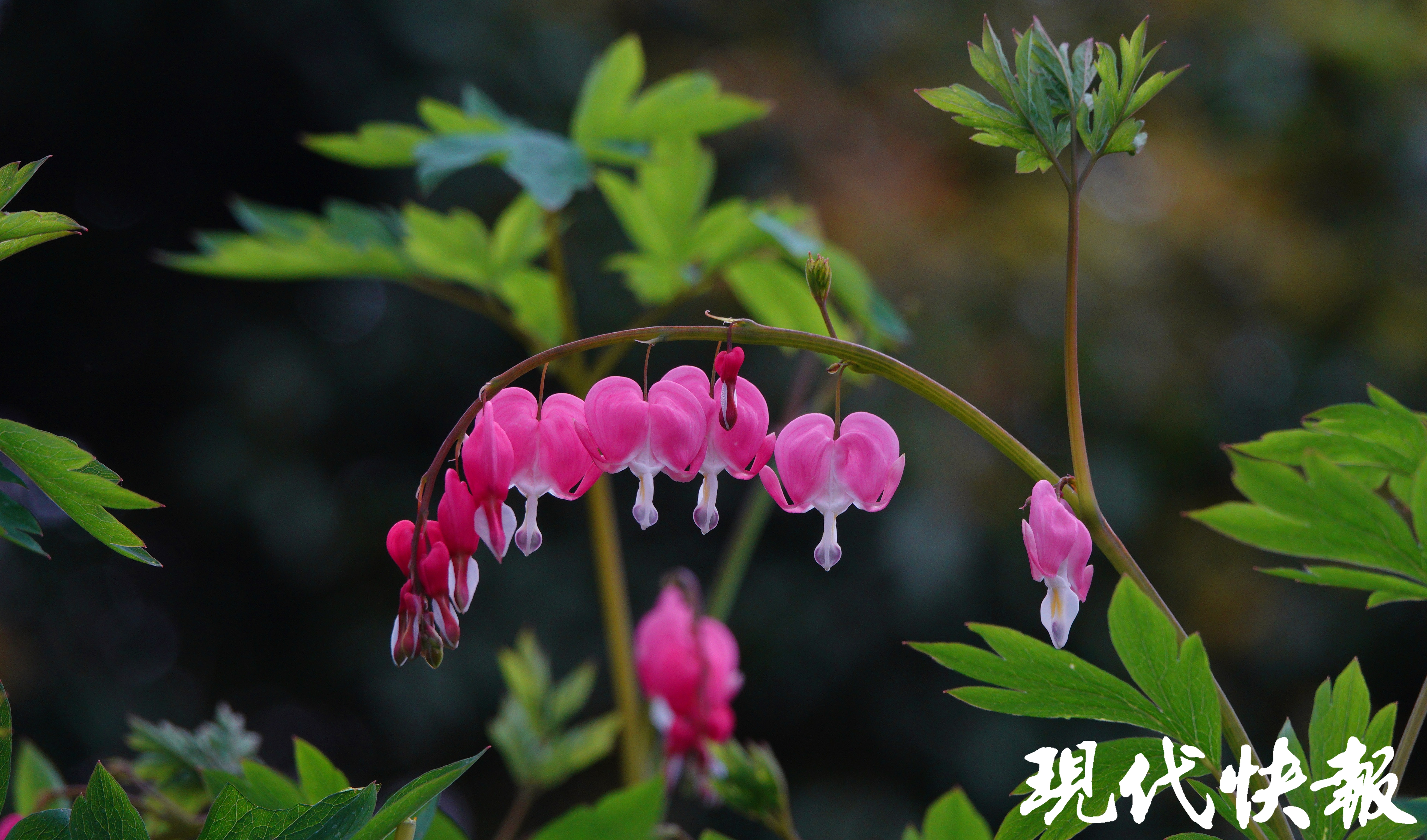 花丛中,有一种长得不像牡丹的花让人眼前一亮。一串串粉红色的心形花朵像荷包,叶子和牡丹叶长得很像,被称为“荷包牡丹”,并不是真正的牡丹。