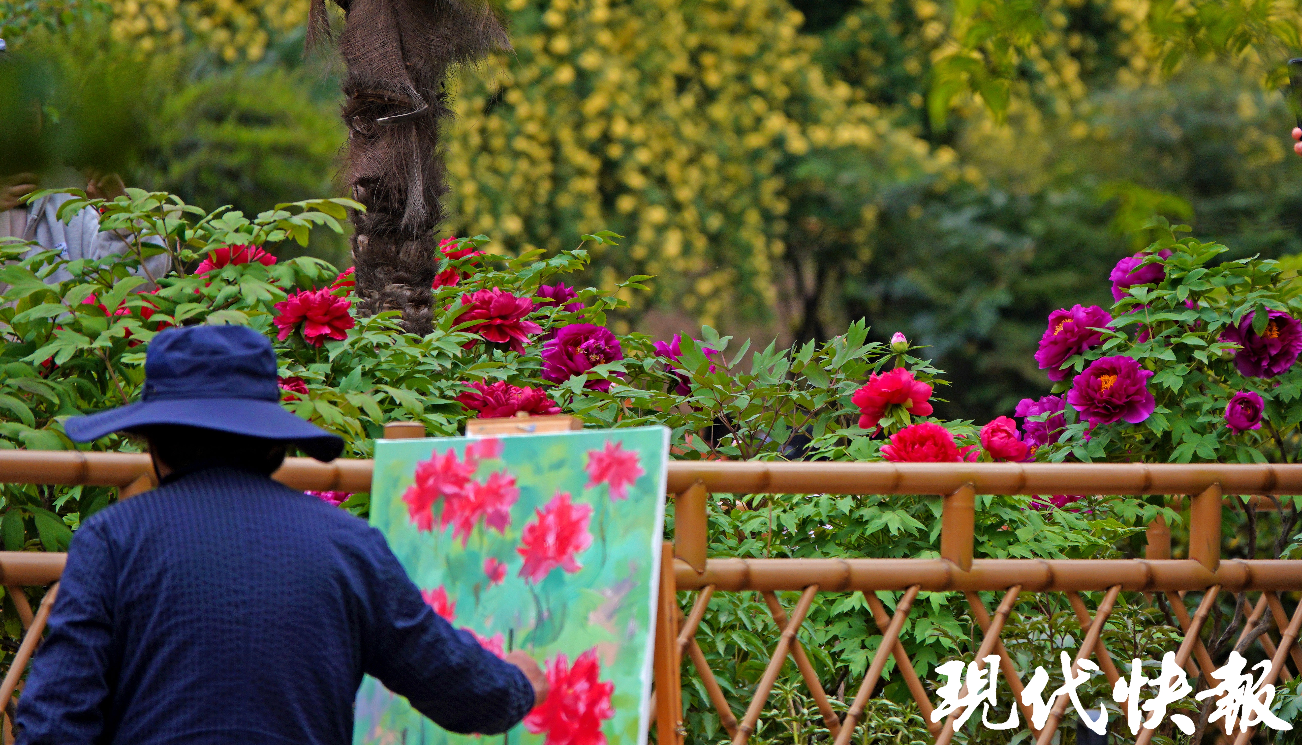 牡丹花前,有市民正拿着画笔写生,用一幅水墨画留下这个春天的美。