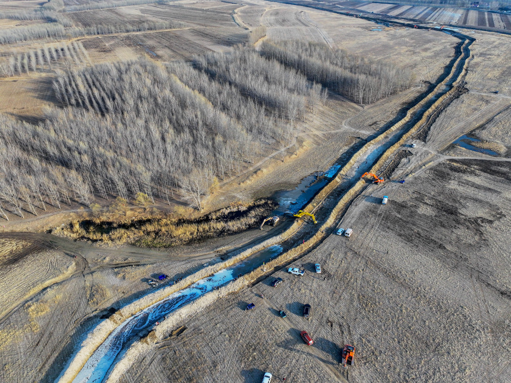 4月8日,在通辽市科尔沁左翼中旗门达镇四合村北,通辽市水务局组织工程机械开挖河槽,保障水头顺利行进。新华社记者 连振 摄