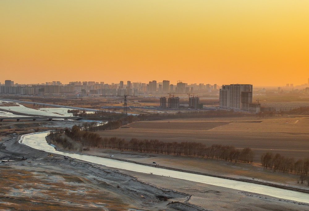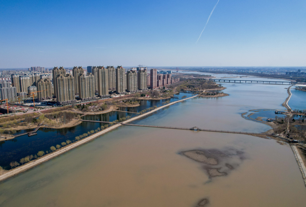 4月8日,西辽河水穿过通辽城区(无人机照片)。新华社记者 连振 摄