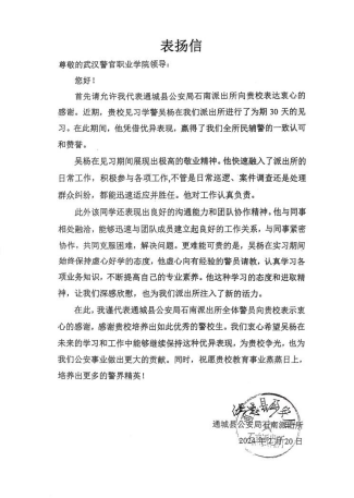 “吴杨同学展现出的不仅是个人素质,更是我校‘大思政’育人体系的成果。”武汉警官职业学院警察管理系主任在实习总结会上评价道。他用行动证明,警徽下的青春,在基层淬炼中愈发闪亮。在产教融合、校局合作的沃土上,像吴杨这样的新时代警校生正不断涌现,他们在基层实践中锻炼自我,共同书写着警务人才培养的“湖北样本”。