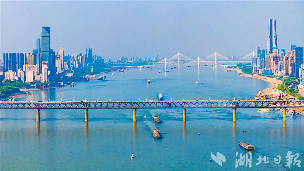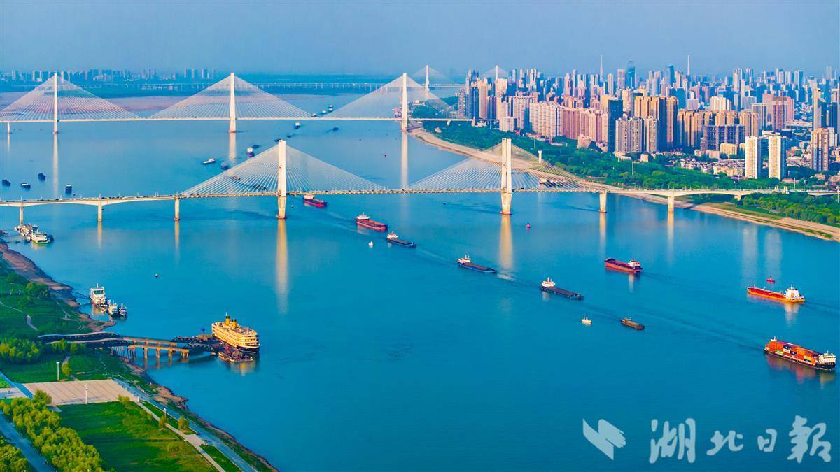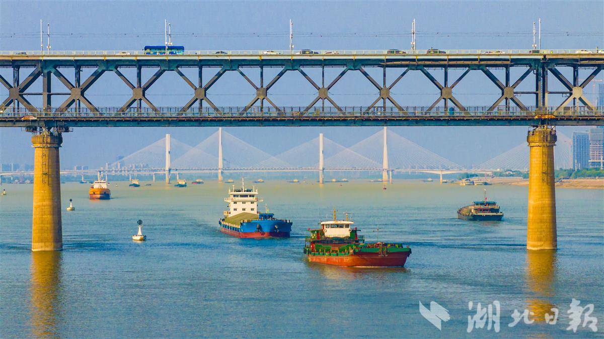 4月10日,在长江武汉段江面上,货船有序穿梭,素有“黄金水道”之称的长江航运呈现一派繁忙的运输景象。(湖北日报全媒记者 任勇 摄)