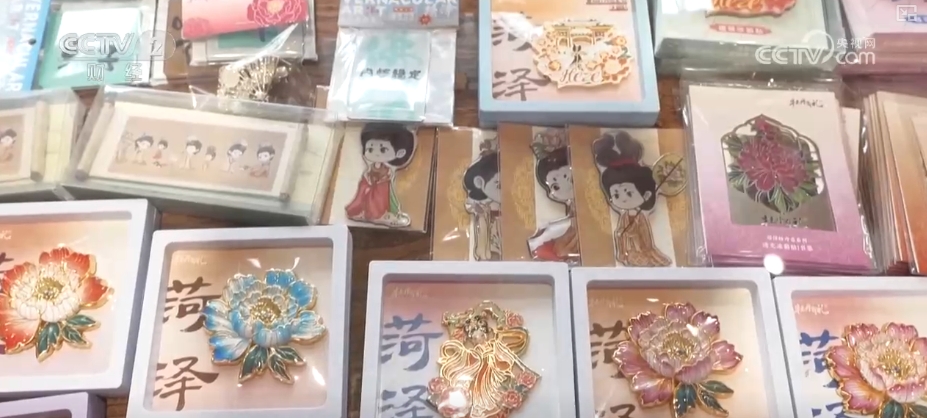 菏泽的一个牡丹园的文创产品展示区,吸引了不少游客驻足。带有牡丹元素的冰箱贴、胸针、香薰、发簪都让人爱不释手。
