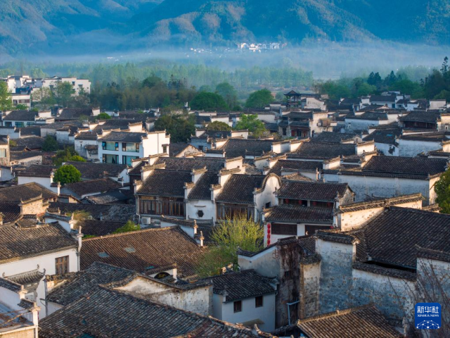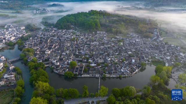 4月18日清晨拍摄的安徽省黄山市黟县宏村风光(无人机照片)。