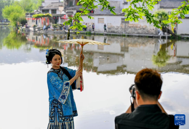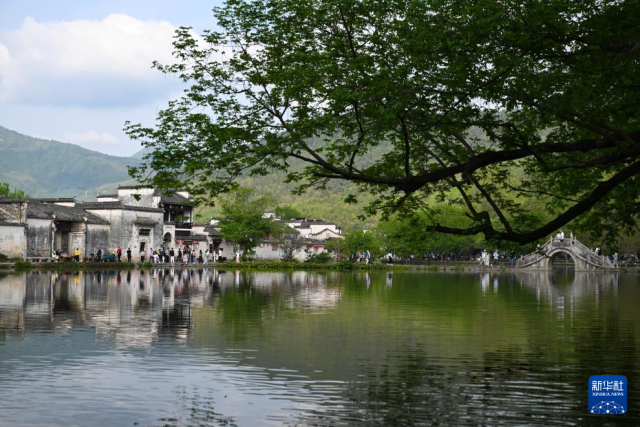 4月17日,在安徽省黄山市黟县宏村南湖,游客在桥上行走。