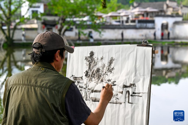 4月17日,绘画爱好者在安徽省黄山市黟县宏村写生。