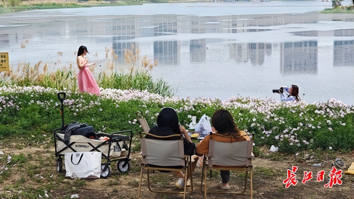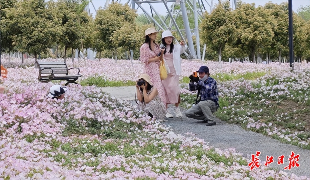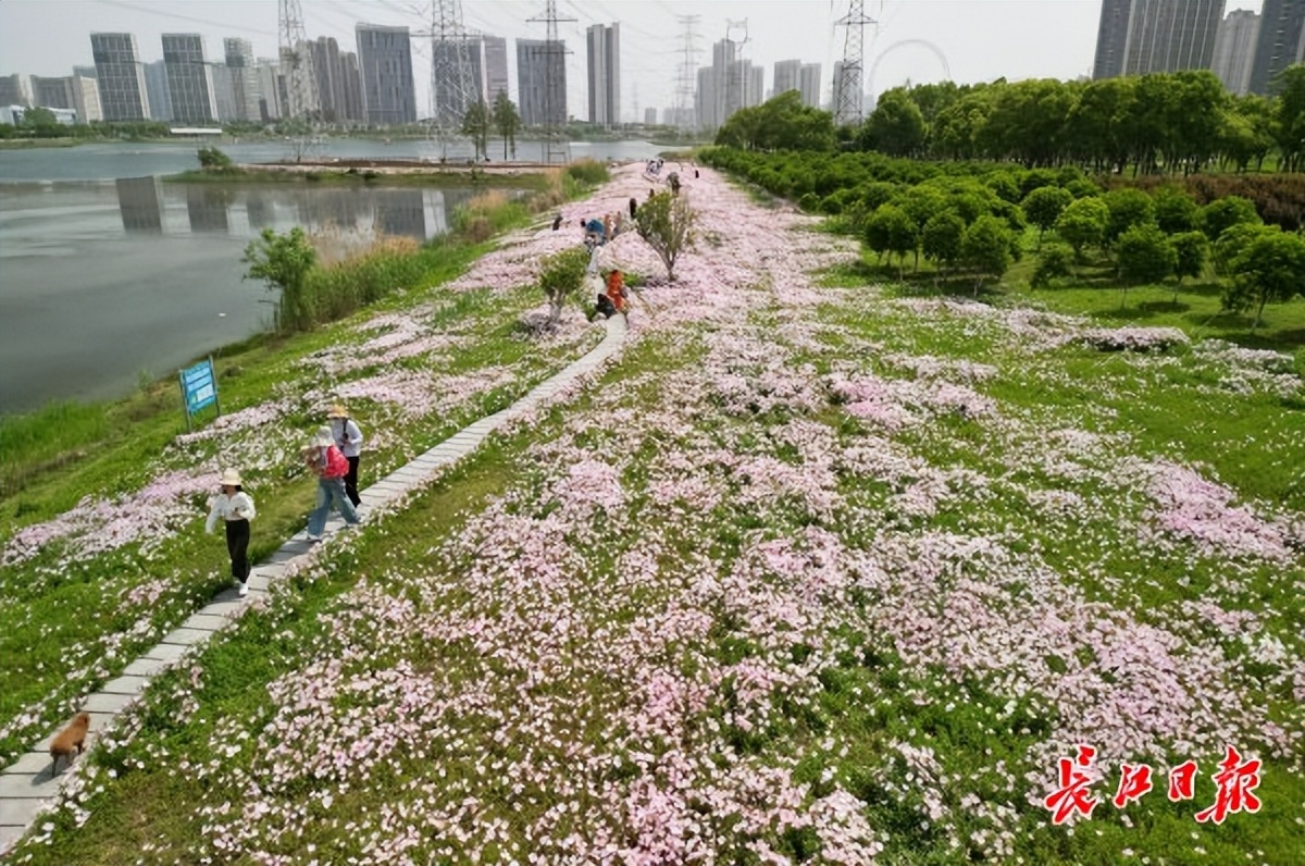 4月17日,位于武汉市东西湖区的黄塘湖公园里,湖畔种植的月见草花开正旺,绵延数百米,吸引了众多市民和游客前来赏花。赏花人仿佛置身一片粉色海洋中,又好像身处童话世界里。