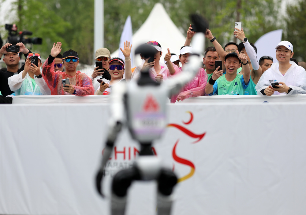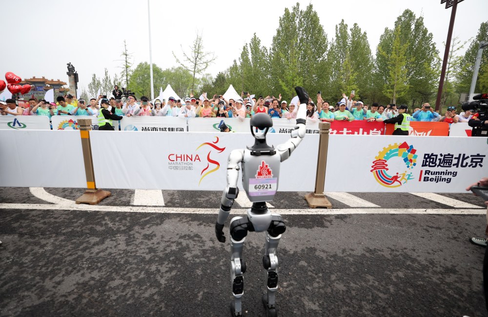4月19日,天工队选手天工Ultra(中)从起点出发。新华社记者 曹灿 摄