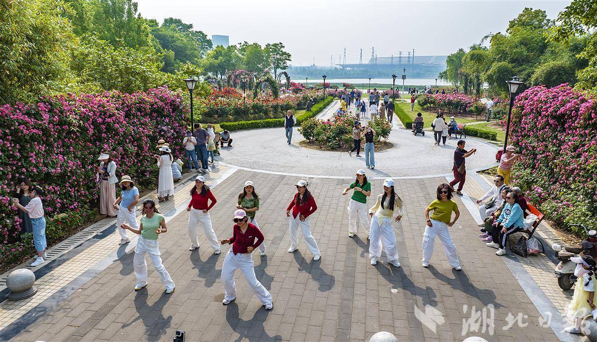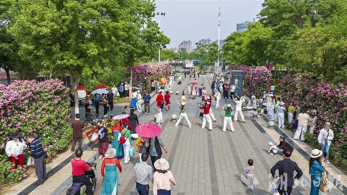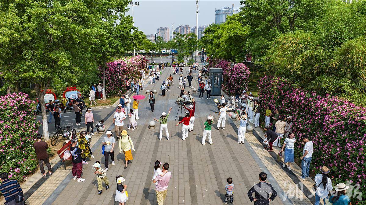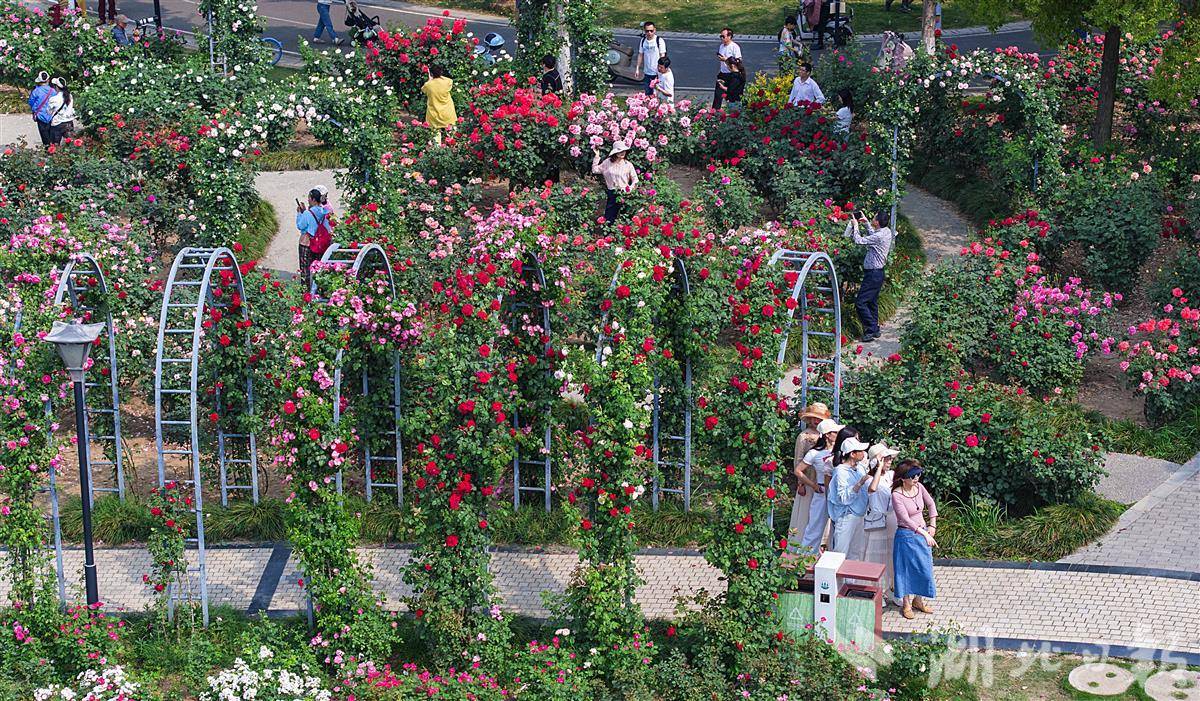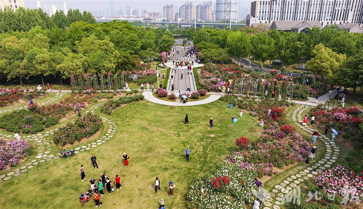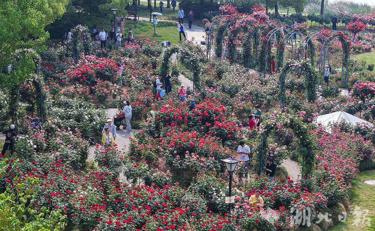 4月20日,鸟瞰武汉市杨春湖湿地公园西区月季、蔷薇专类园,镜头下大面积的月季花、蔷薇花绽放,将整个公园装点成一片色彩斑斓的花海,吸引了众多市民游人前来赏花打卡。(湖北日报全媒记者 朱熙勇 摄)
