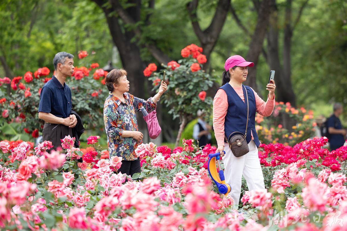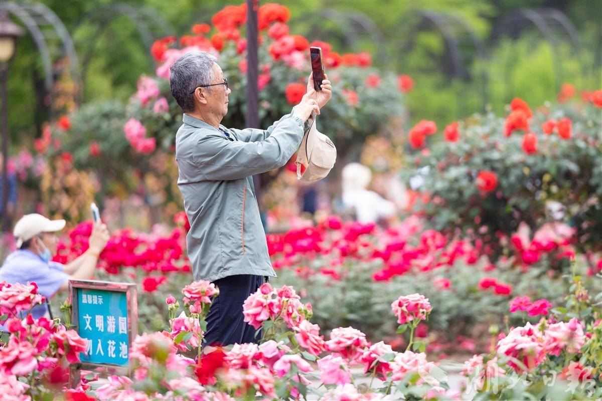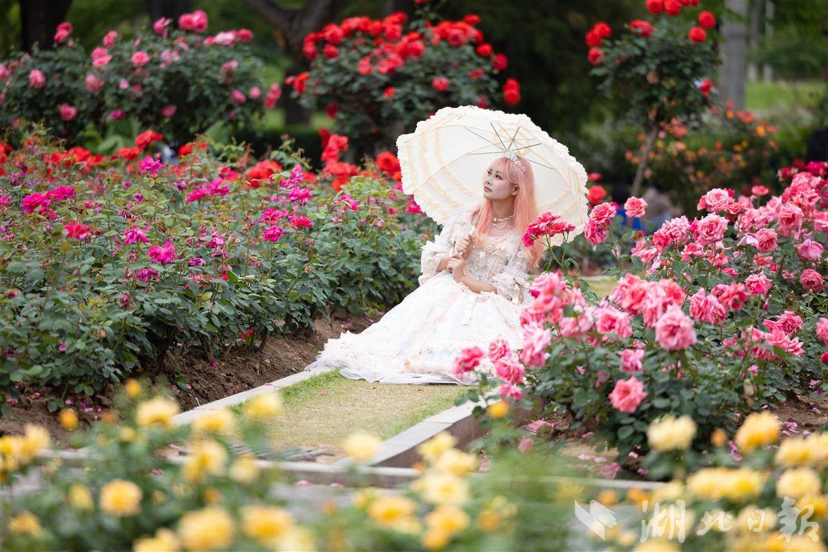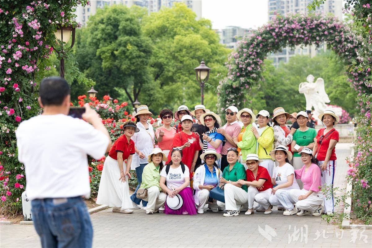 2025年4月23日,在武汉市青山区和平公园,大片月季花盛开,吸引众多市民游客慕名前来打卡拍照。据了解,武汉市青山区和平公园第十七届月季节近期即将开幕,80余个月季品种,共计3万余株月季花免费向市民游客开放观赏。(湖北日报全媒记者 何宇欣 摄)