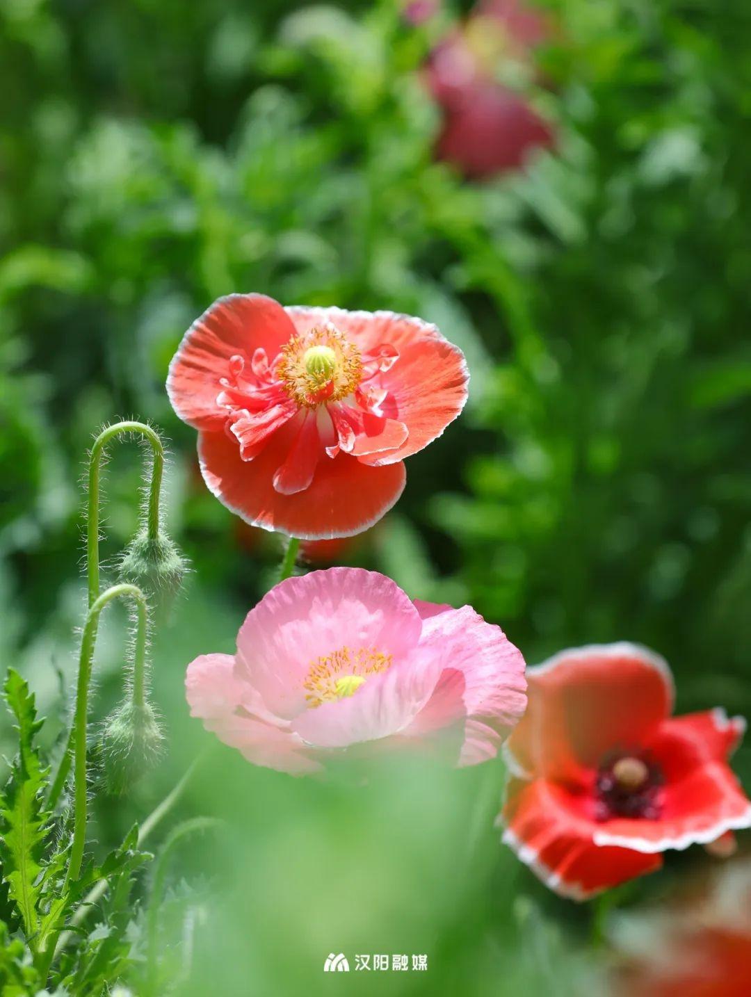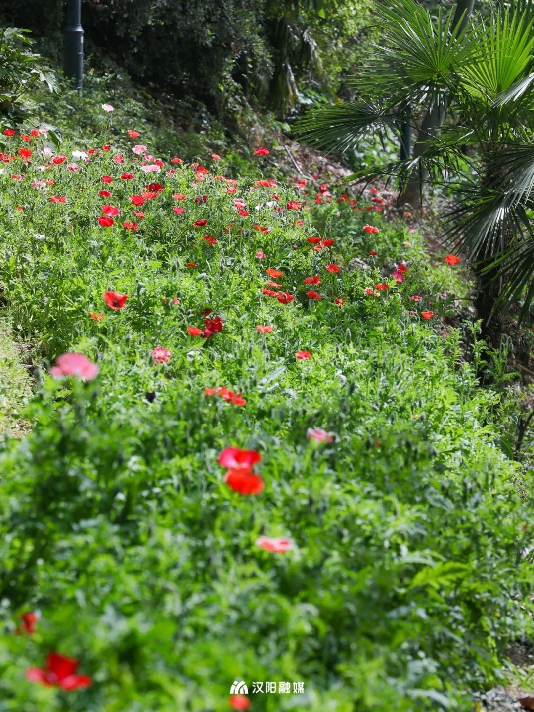 此外,樱花栈道对面的山坡上,虞美人花开正艳,红、白、粉的明艳色调装点山坡,为龟山增添娇艳浪漫的韵味。