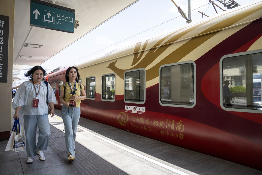 当日,湖湘主题旅游专列“南方列车·潇湘号”从长沙首发开往韶山。据了解,该专列由广铁集团与湖南旅游集团联合打造,将湖湘历史人文、非遗技艺、特色美食等元素融入车厢设计,让旅客在旅途中沉浸式感受湖湘文化。