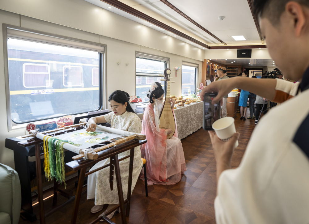 4月25日,在“南方列车·潇湘号”旅游专列上,旅客在观看表演。新华社记者 陈思汗 摄