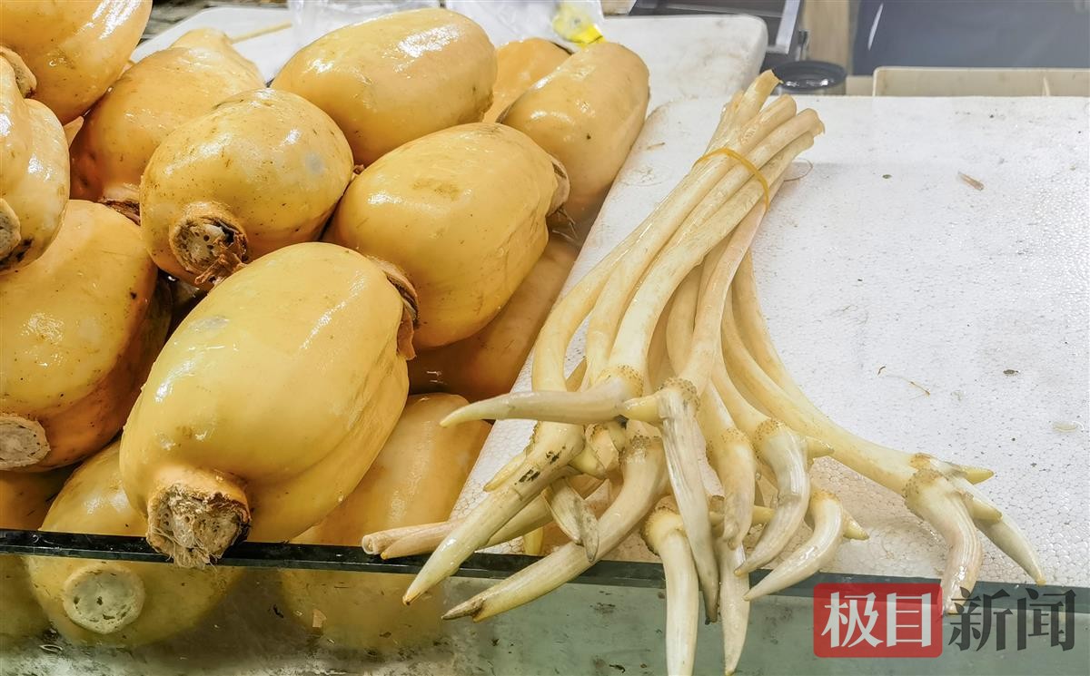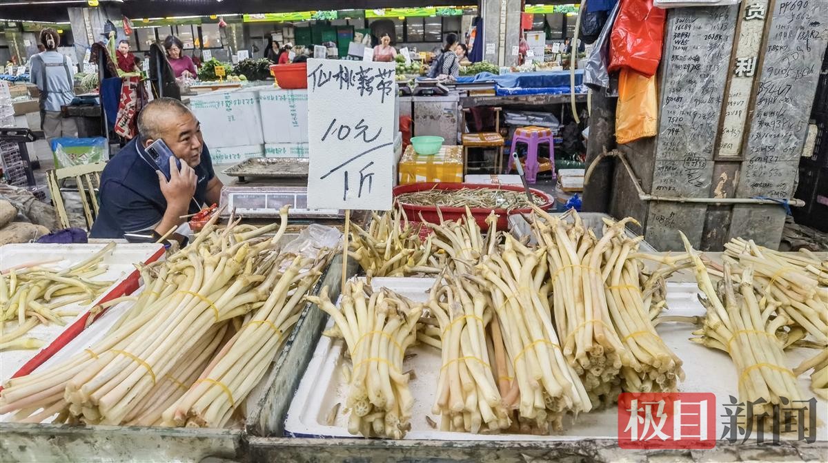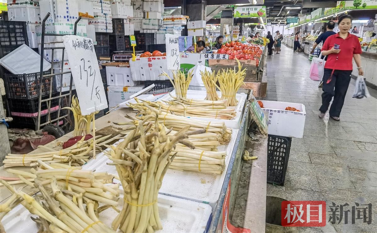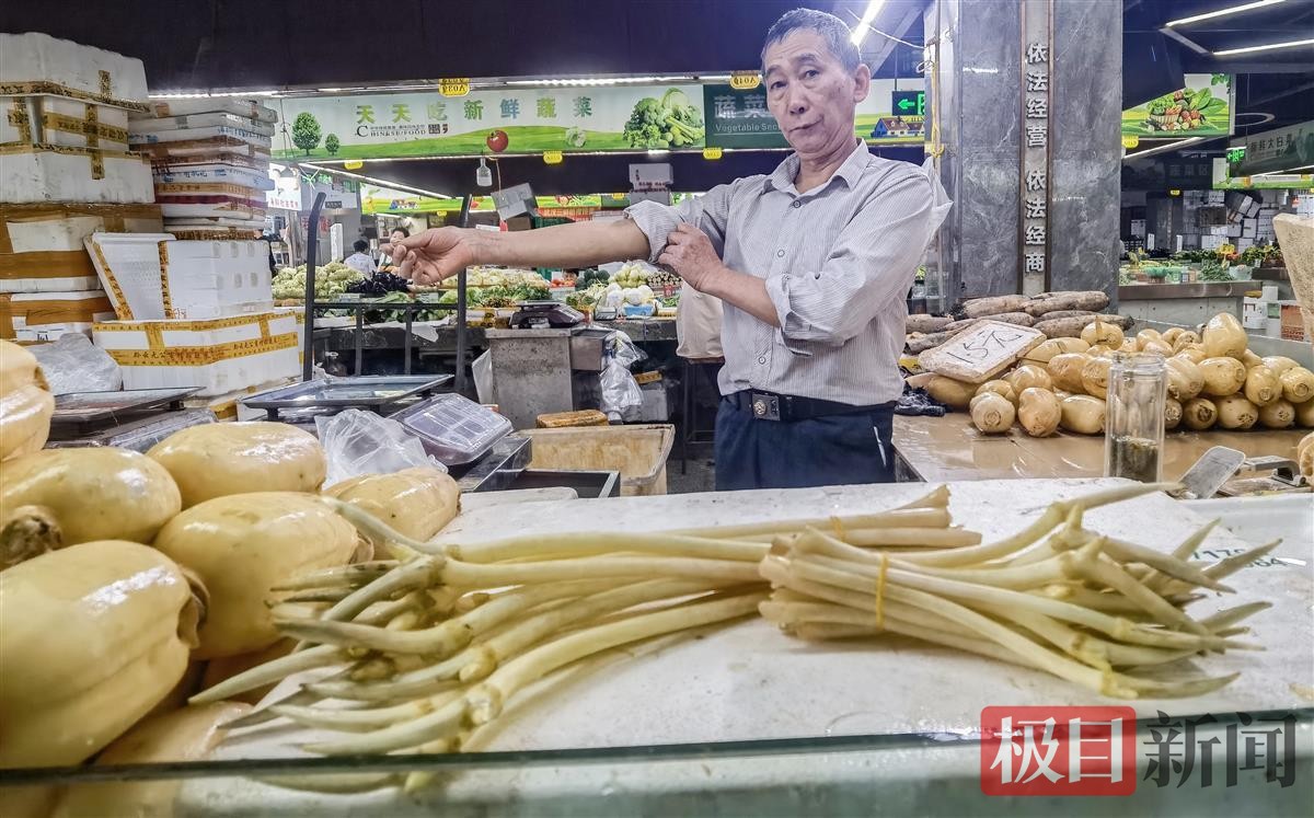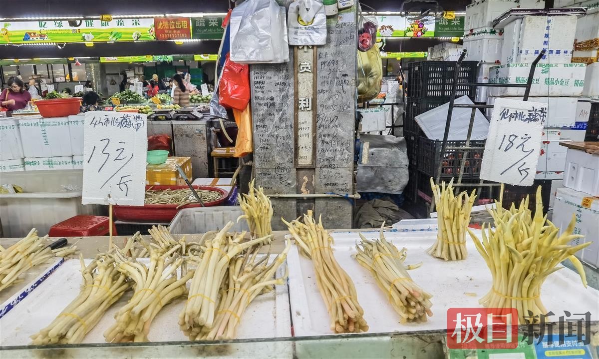 4月26日,在武汉光谷立信生鲜大超市,周末采买蔬菜的市民惊喜地发现,脆甜的藕带已上市了,价格从10元到25元一斤不等。