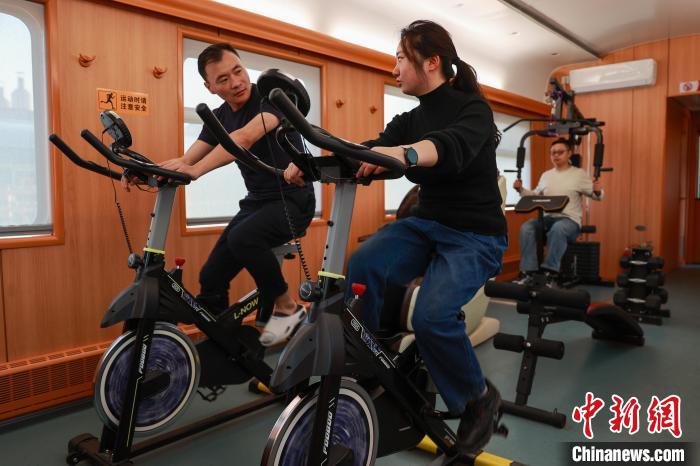 4月27日,中国铁路青藏集团有限公司西宁工务机械段养路机械驾驶员余庆(右一)和同事在宿营车内健身。 中新社记者薛蒂摄