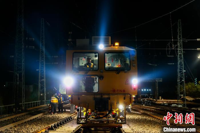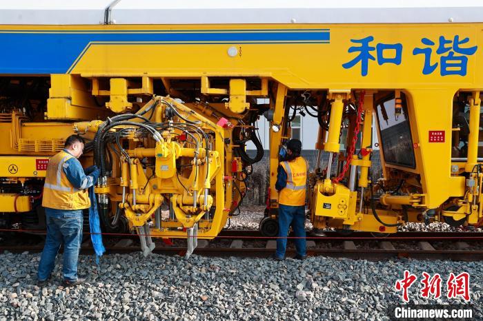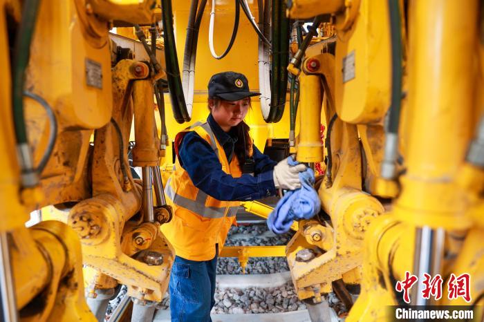 4月27日,中国铁路青藏集团有限公司西宁工务机械段养路机械驾驶员俞庆擦拭捣固车工作装置。 中新社记者薛蒂摄