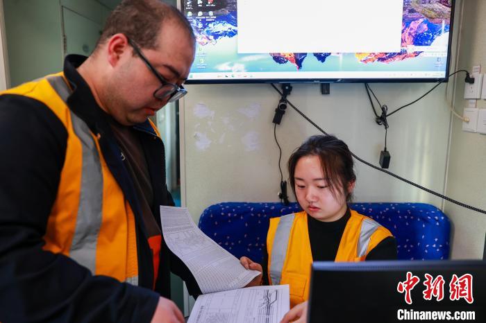 4月27日,中国铁路青藏集团有限公司西宁工务机械段养路机械驾驶员俞庆(右一)与同事交接文件。 中新社记者薛蒂摄