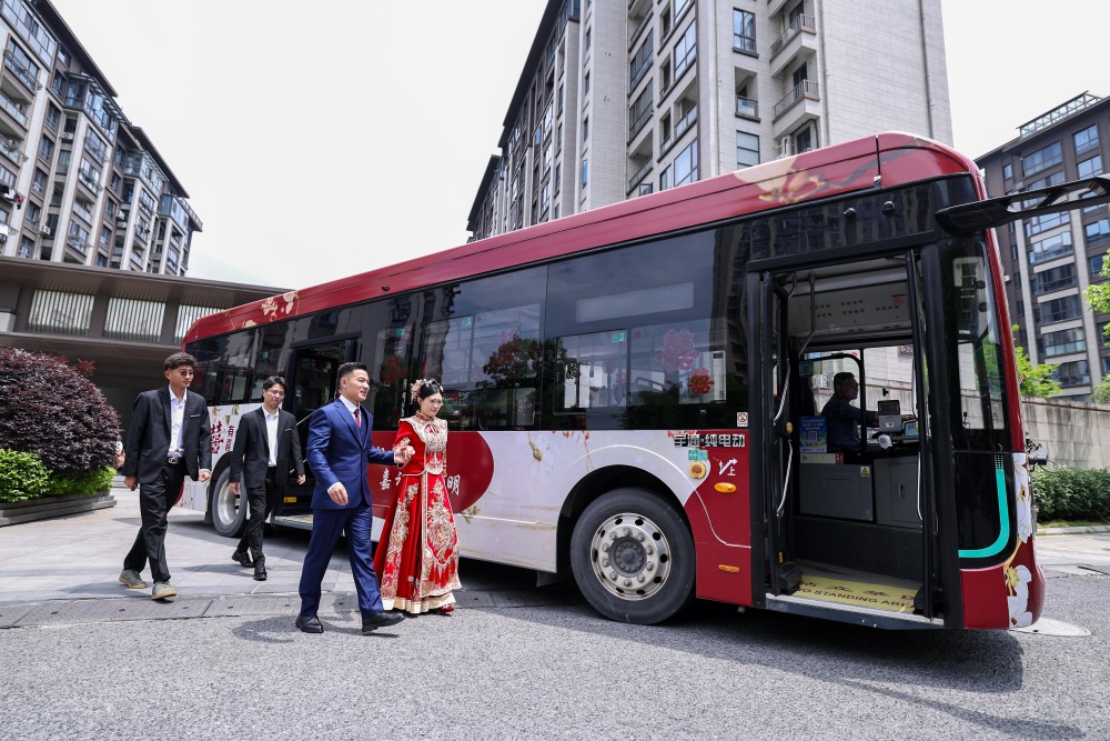 4月30日,“爱情巴士”搭载着新郎新娘前往诸暨市同山镇唐仁村祠堂进行婚礼仪式。新华社记者 江汉 摄