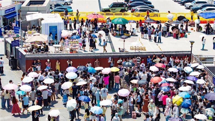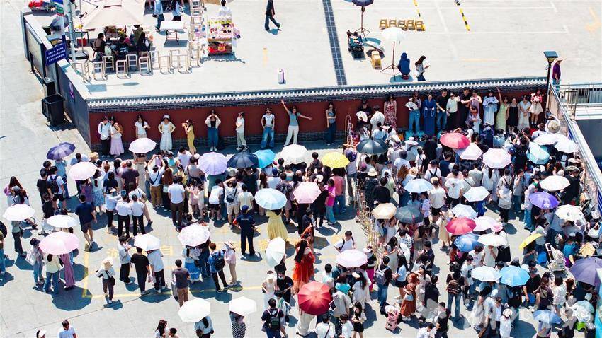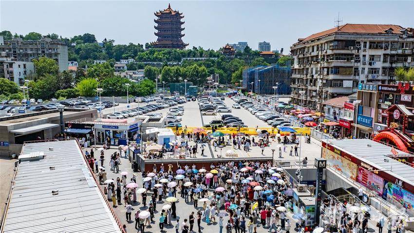 2025年5月1日,“五一”小长假首日,武汉地铁5号线司门口黄鹤楼站C出口旁的红墙吸引众多外地游客前来拍照打卡。为杜绝部分商业旅拍摄影师长期占位影响游客体验感,红墙前方新设置了专门的游客自拍区域,游客可自由免费打卡拍照。该红墙自2023年设立以来,地铁司门口黄鹤楼站客流屡破新高,其中大多数都是外地游客前来和黄鹤楼合影打卡,在红墙与黄鹤楼同框成为不少外地游客来汉的必定行程之一。(湖北日报全媒记者何宇欣 实习生李昕蓉摄)