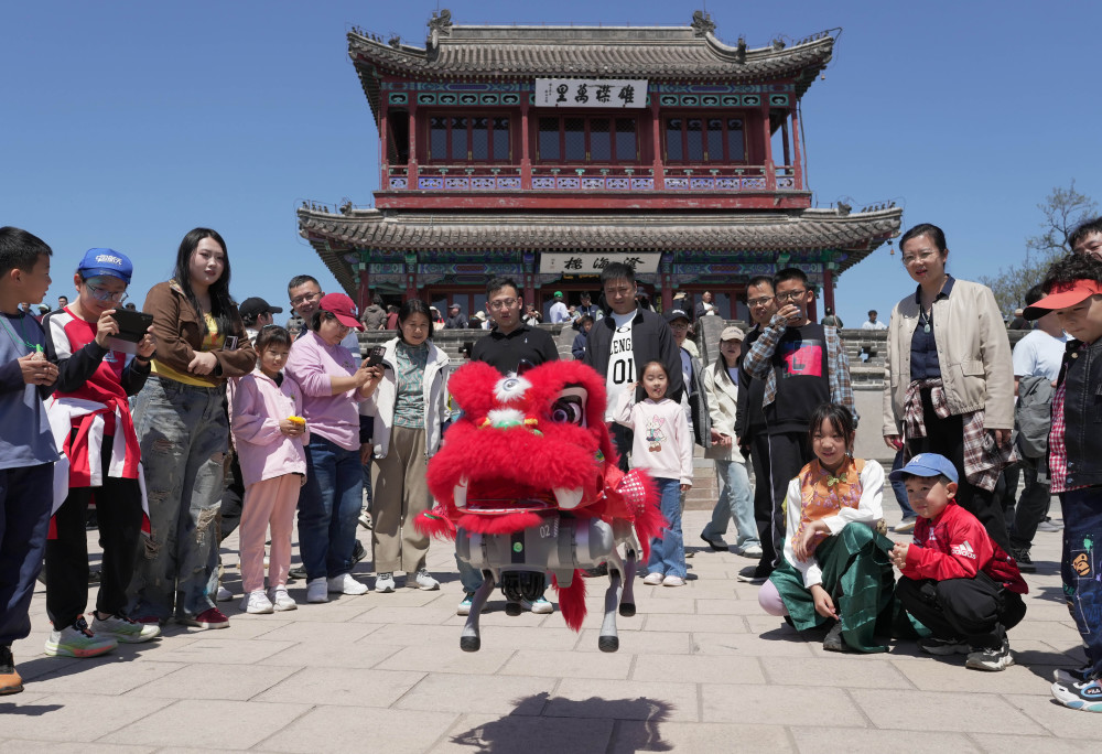 5月1日,游客在河北省秦皇岛市山海关区老龙头景区观看机器人表演。新华社记者 杨世尧 摄