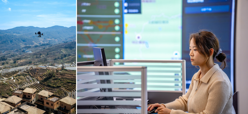 这是一张拼版照片。左图:2月28日,云南省元阳县哈尼小镇的无人机在执行巡视任务(无人机照片);右图:2月28日,红河哈尼梯田世界文化遗产管理局的工作人员陈星宇在控制无人机集群操作系统执行巡视任务。新华社记者 胡超 摄