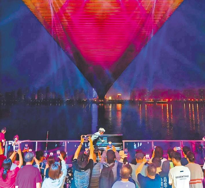 5月16日,仅靠一个背影刷屏朋友圈的“海上钢琴师”重新现身杨泗港大桥下,为即将开放的“江影·杨泗港城市灯光音乐社”彩排预演。
