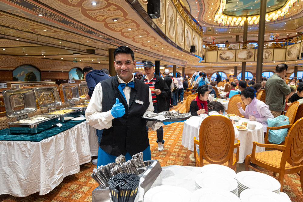 5月27日,工作人员在“爱达·地中海”号上为游客提供服务。新华社记者 潘昱龙 摄